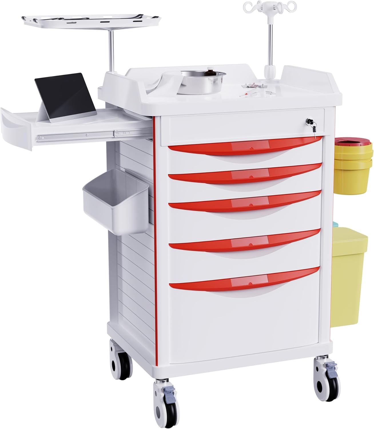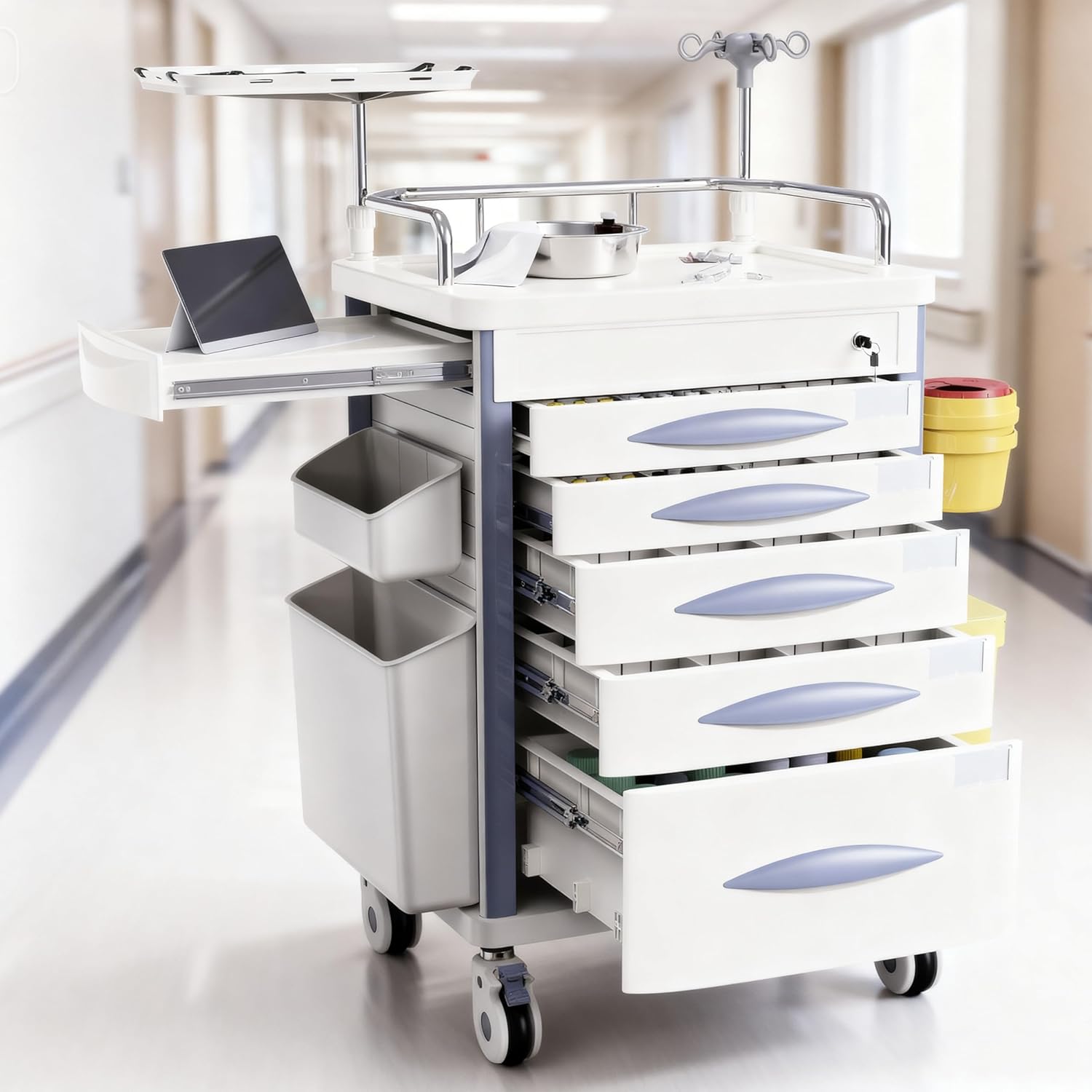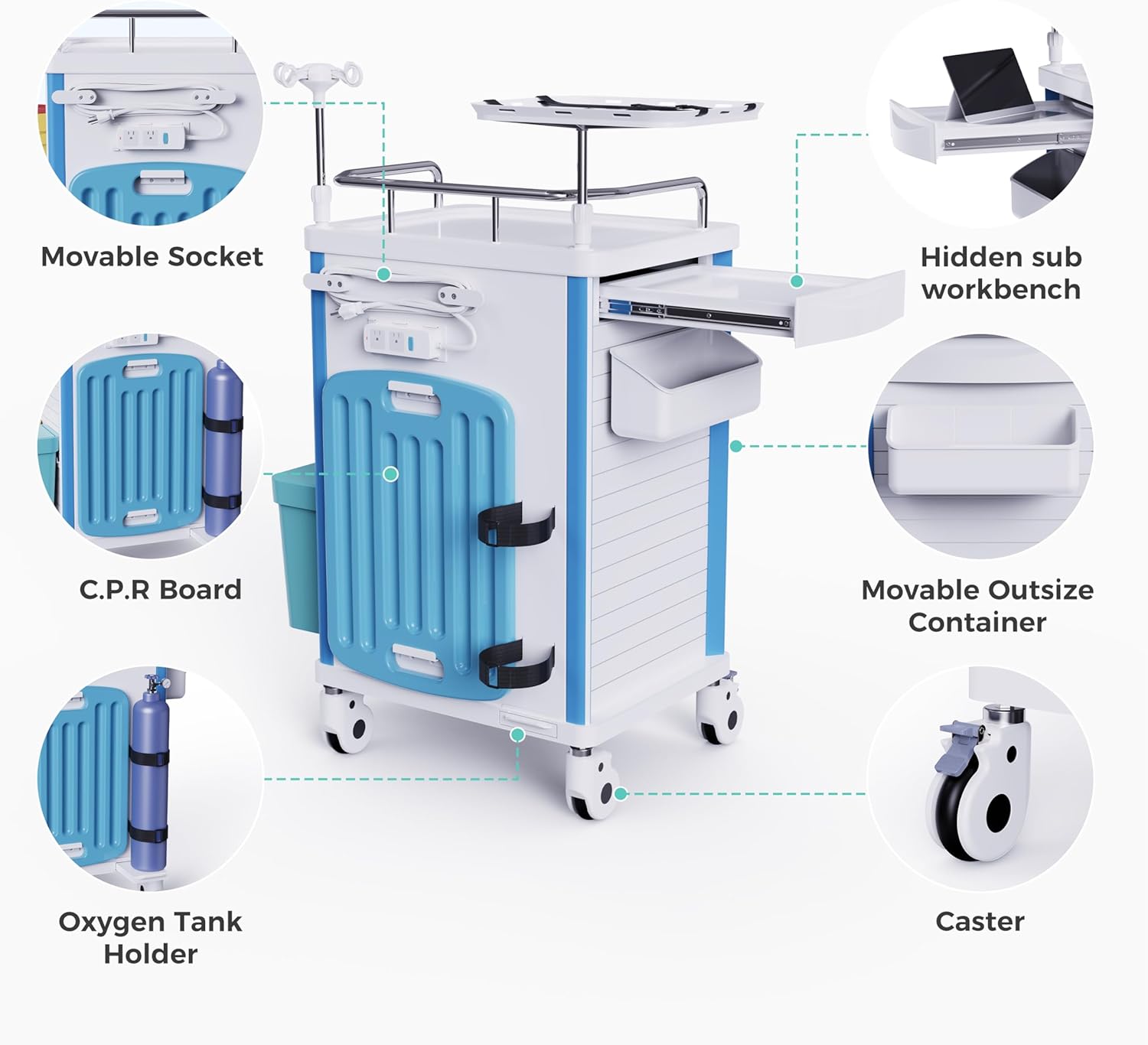 | Additional Features | Sunken Design, Hidden Workbench, Detachable Multi-bin Container, Concealed Expandable IV Pole, Rotatable Needle Disposal Holder, Retractable Oxygen Cylinder Holder, Deluxe Casters with Brakes |