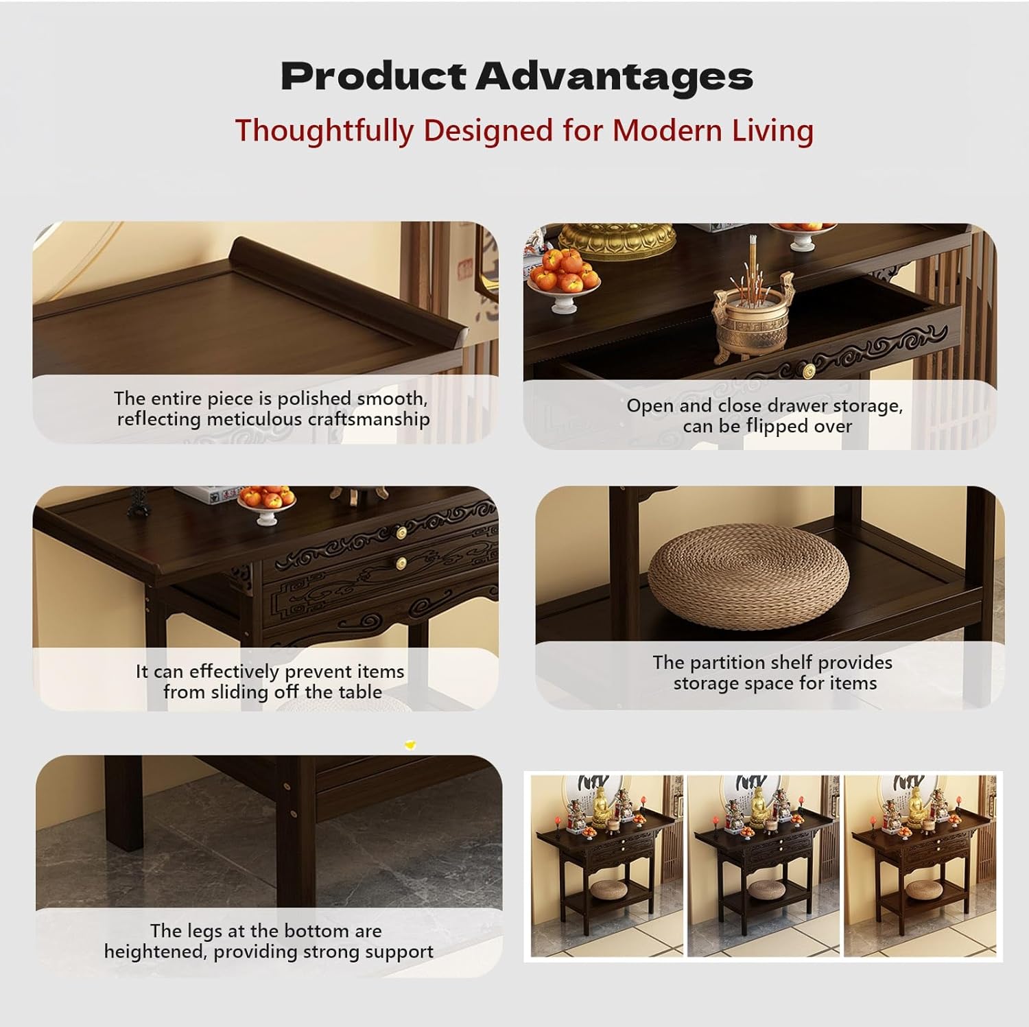 This meditation table has a simple design that naturally blends into Chinese-style living rooms or prayer rooms. It harmonizes beautifully with plants, curtains, and other decorative items, enhancing the cultural ambiance of the space.Product SpecificationsProduct Name: Chinese Buddhist CabinetDimensions: 19.7x13x39.4in , 19.7x15.7x39.4in , 26x13x39.4in , 26x15.7x39.4in , 31.5x13x39.4in , 31.5x15.7x39.4in , 39.4x13x39.4in , 39.4x15.7x39.4in , 47.2x13x39.4in , 47.2x15.7x39.4inColor: WalnutMaterial: BambooSuitable Locations: Living rooms, bedrooms, balconies, shrines, ancestral halls, and templesPackage Includes: 1x Meditation Table