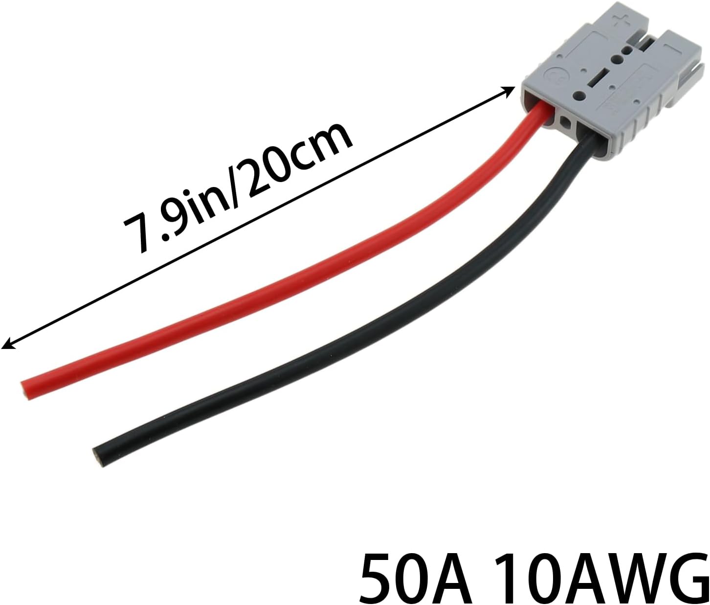 A high-performance charging connection cable specifically designed for industrial and high-power electric equipment. Its core utilizes large-gauge 10AWG conductors and high-quality silver-plated terminals, optimized to transmit currents up to 50A, ensuring efficient charging with minimal energy loss. The robust flame-retardant housing and high-temperature-resistant silicone wire, combined with the quick-connect Anderson-style interface, provide a reliable, convenient, and safe connection solution in demanding working conditions. It is a practical accessory for equipment maintenance and upgrades. Product Features: Plug Material: PC flame-retardant plastic; Terminal Material: Silver-plated copper; Cable Specification: 10AWG tinned copper wire, silicone outer sheath (gray); Cable Length: 20 cm (approximately 0.66 feet); Electrical Specifications: Rated current 50A, maximum voltage 600V DC, flame retardant rating UL94V-0; Package Contents: 2 identical specification connection cables (each cable has a male connector on one end and a female connector on the other end).