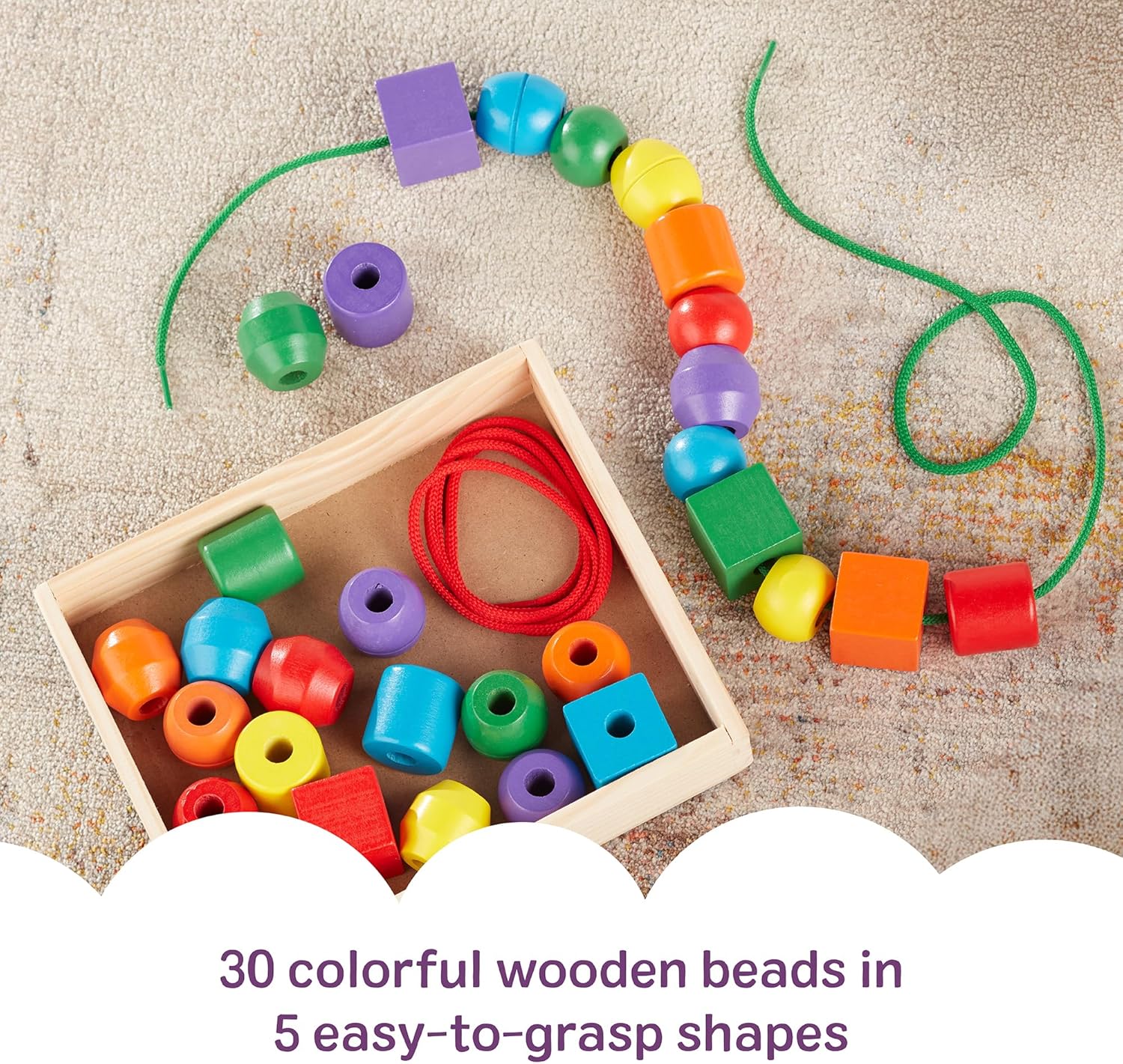 Product Description Spark creativity and learning with the Melissa & Doug Primary Lacing Beads Set, a colorful classic in kids crafts and DIY bead kits. This engaging arts and crafts activity includes 30 hand-painted wooden craft beads in six vibrant colors and five fun shapes, along with two colorful bead strings perfect for little hands to thread, sort, and design. Ideal for preschool learning and Montessori-style play, this bead set helps children develop fine motor skills, hand-eye coordination, color and shape recognition, and early cognitive abilities through interactive, screen-free play. The smooth, easy-to-grasp beads encourage pattern creation, pretend play, and creative expression, making it a versatile toy for both solo and guided activities. Parents and educators can use the set for sorting games, pattern-making, and early math concepts, while kids enjoy hours of imaginative play. Whether used at home or in the classroom, this bead set supports developmental milestones and fosters independent learning. For more creative fun, combine this with the Melissa and Doug Decorate Your Own Wooden Butterfly, the Deluxe Wooden Standing Art Easel, Paint & Drawing Supplies, for meaningful learning beyond the classroom. . For 35+ years, Melissa and Doug has crafted imaginative preschool toys and durable wooden toys built to nurture childhood wonder, with everything from a life-sized grocery store playset to a play kitchen playset and play food to serve plush toys & puppets, to costumes, arts & crafts, and road trip activities for kids. It’s the kind of kid-powered play that builds independence and confidence! From the Manufacturer From classic wooden toys to crafts, pretend play, and games, Melissa & Doug products provide a launch pad to ignite imagination and a sense of wonder in all children so they can discover themselves, their passions, and their purpose. Since the company’s founding more than 25 years ago, Melissa & Doug has consistently delivered innovative products that inspire open-ended thinking, encourage kids to see new possibilities, and offer Countless Ways to Play. It’s part of a bigger vision to Take Back Childhood. Because by giving children a true childhood with the space and freedom to explore their world, we give them a path to realizing their full potential!