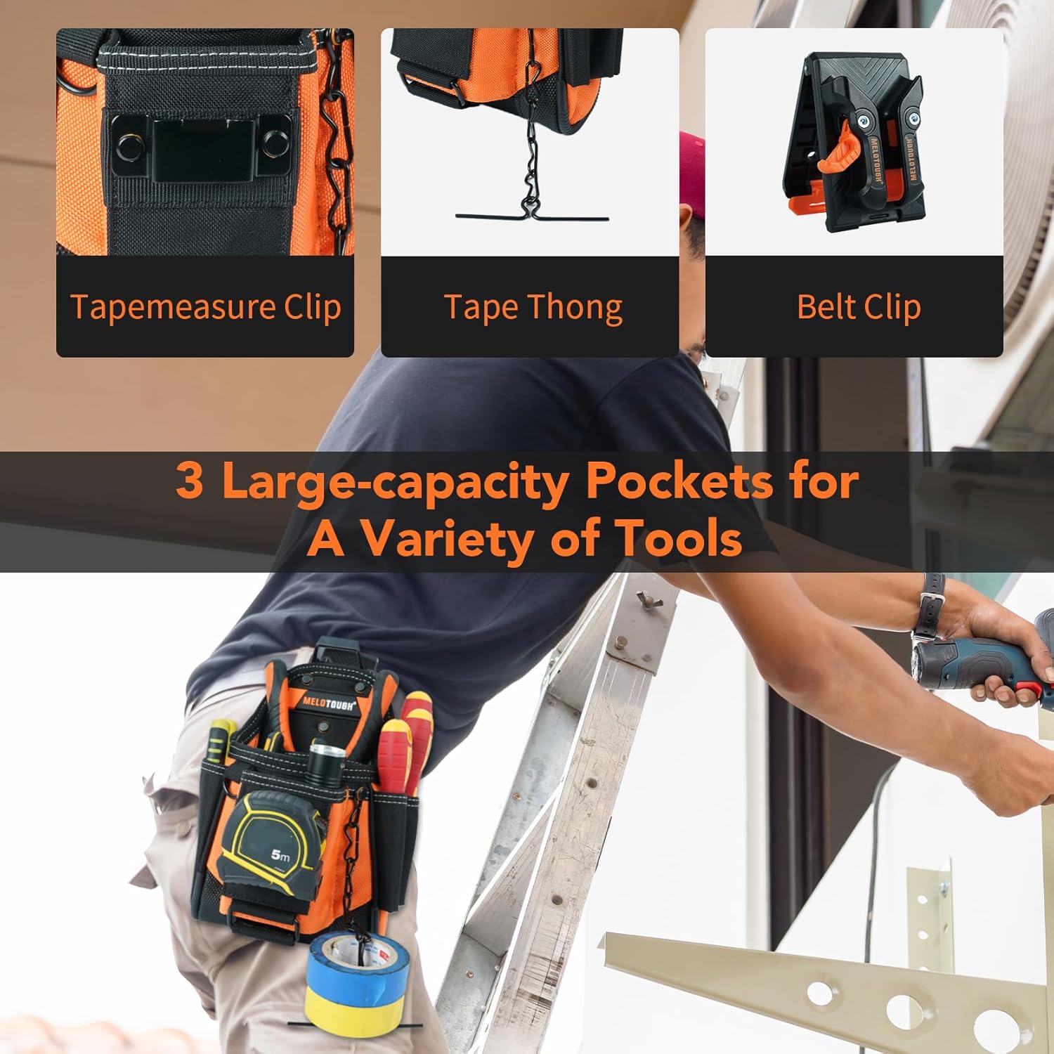 MELOTOUGH Small Electrician Tool Pouch for Tool Belt with Belt Clip Attachment 9 Pockets Tradesman Tool Bag Pouch with Tape Thong Electrician Tool Holster(Orange + MELOTOUGH Electrician Tool Pouch with Shoulder Strap, Zippered Flip Cover Tool Pouch Bag with Multiple Storage Pockets for Electricians, Technicians, Maintenance (Yellow)