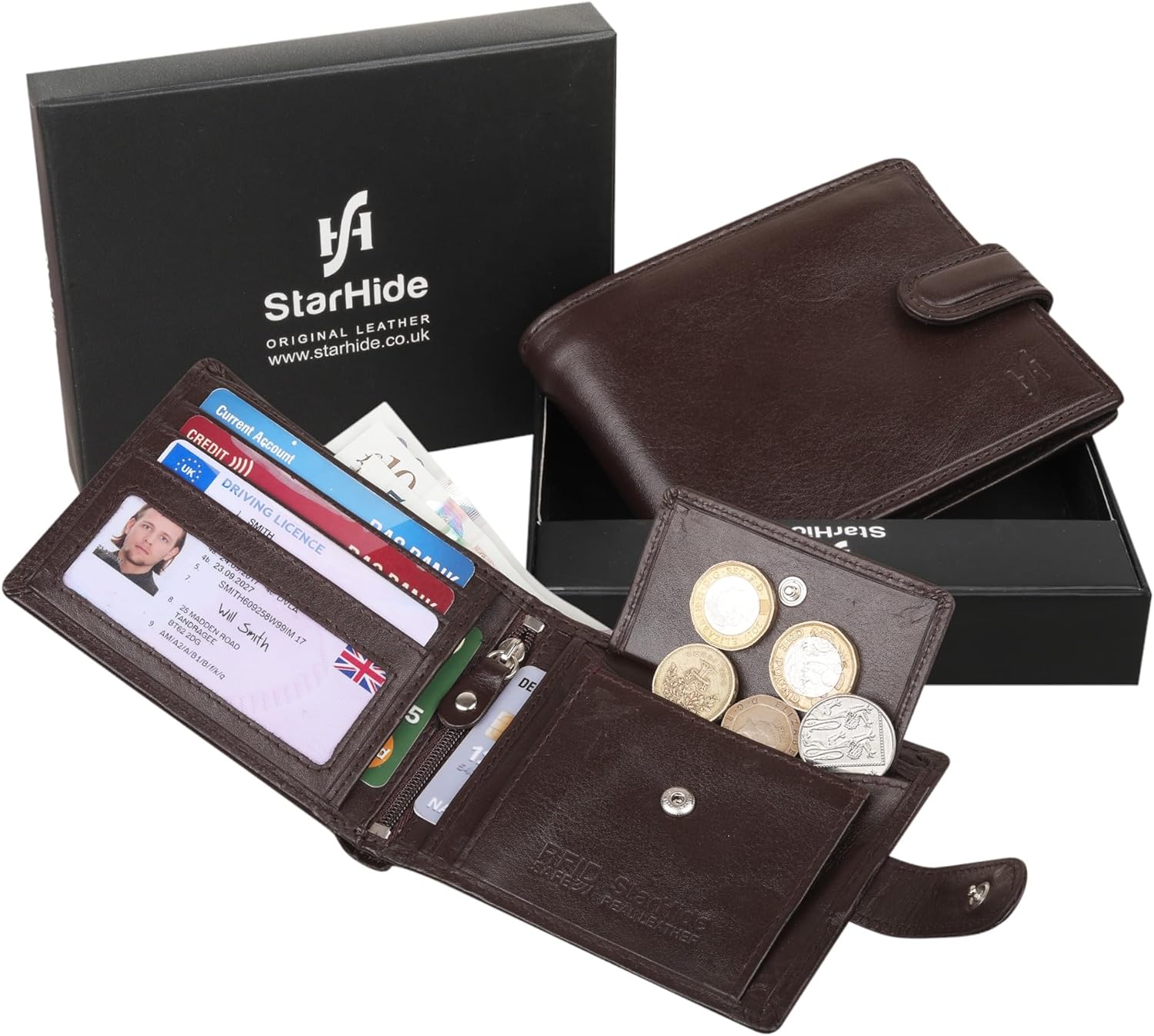 StarHide Classic style and absolute elegance defines this wallet from the house of StarHide Leather. This uniquely designed wallet will surely be an amazing addition to your accessories collection. Made from real leather this wallet will retain it's quality for years to come. The sleekly designed body allows you to carry this wallet easily in your trouser pockets. The wallet is a decent size not overly large a good size to comfortably slip into a pair of jeans' pockets and with all the necessary compartments. The interior is fully lined. Neat contrast stitching accentuates the wallet's fine features. It has 3 Banknote compartments (1 Zipped compartment) and it is just the right height to cover up the larger dimension £50's notes. It will carry your Banknotes Debit Credit cards and some loose change coins for your everyday use. Bi-fold Wallet with ID card and credit card slots. 2 Credit card pouches. 1 ID card window slot 1 Coin pocket. 2 Additional hidden slip-in card pocket + 2 Zipped pockets. It Measures 12cm x 10cm (Folded).
