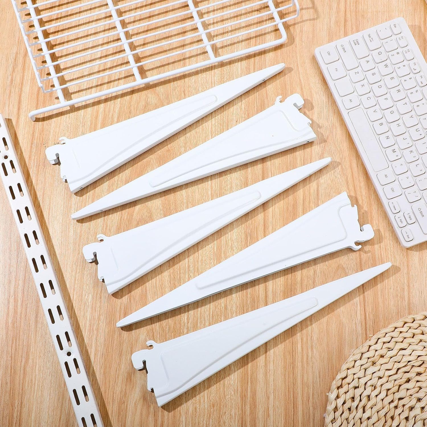 Features: Vibrant Design: Works with all ventilated Shelving, protects shelf vinyl coating, locks Shelving in place, exclusive locking tab prevents injury & property damage, shelf cannot be pushed up & unlocked. Reliable Quality: Use for shelves and hanger bar supports, a double-slot design ensures strength and adjustability for secure brackets at just the right shelf height. Specifications: Material: steel Color: White Size: approximately 12 inches/30.5 cm Package includes: 6 X locking shelf brackets Notes: Manual measurement, please allow slight errors on size. The color may exist a slight difference due to different screen displays.
