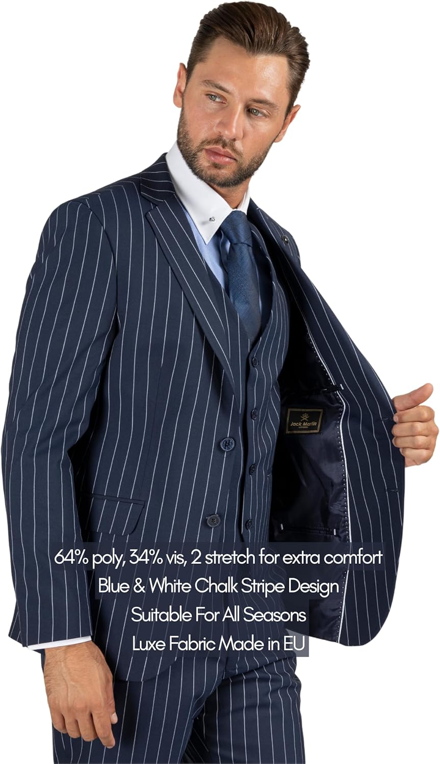 Jack Martin, our exclusive label, elevates men's style with impeccably tailored suits that effortlessly blend classic aesthetics with contemporary details. Our premium collection includes sophisticated mens suits and stylish suits for men, perfect for any formal or special occasion. Whether you're seeking a distinguished pinstripe suit for a professional appearance or a striking 3 piece suit to turn heads at weddings or proms, Jack Martin has you covered. Expertly crafted for precision and comfort, each suit features a blazer, vest, and trousers designed to enhance your silhouette, ensuring you stand out in every room. Achieving a well-fitted suit is key to a charming look. Take precise measurements to guarantee a flawless tailored fit suit, boosting your confidence in any situation. From sharp striped suits for important business meetings to the ultimate prom suit for memorable nights, our suits seamlessly meet your style needs. Inspired by timeless British fashion, Jack Martin's pinstripe suits offer a nod to classic elegance while embracing modern sophistication. Our suits capture the timeless charm of iconic styles, making them the perfect wedding suit choice for fashion-conscious men who value tradition with a modern twist. Explore our carefully curated variety, from sophisticated business suits that impress in the boardroom, to bold prom suits and refined wedding suits designed for unforgettable celebrations. Jack Martin ensures you're impeccably dressed, effortlessly balancing timeless elegance and contemporary trends. Discover premium mens suits that harmonize quality, style, and comfort with Jack Martin. Your trusted label for refined menswear.