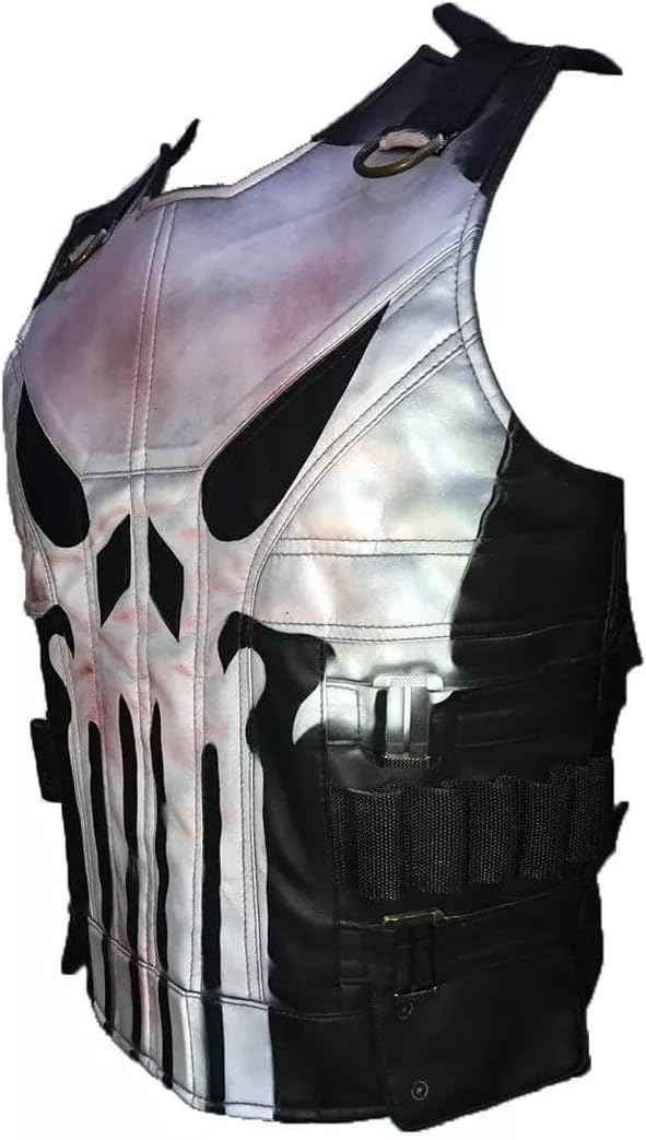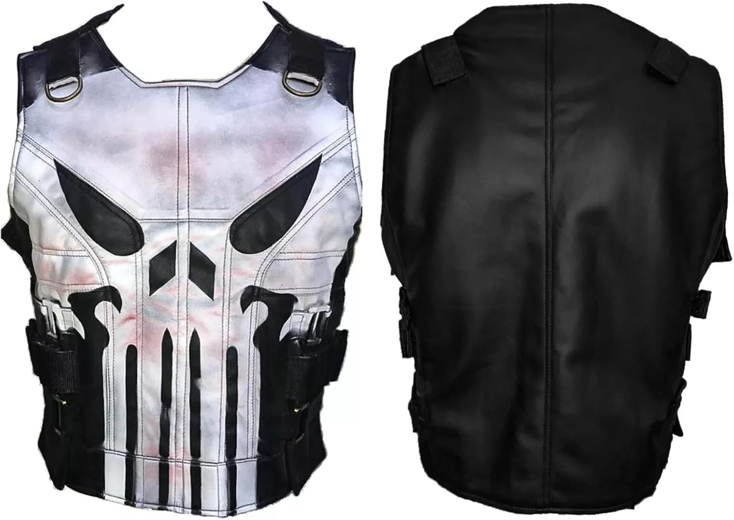 Unleash your inner vigilante with this inspired leather vest, drawing its essence from The Punisher. Crafted from premium real leather, this black vest exudes durability and style. It features a bold skull logo on the front, paying homage to the iconic character. The tactical design and double stitching ensure long-lasting wear, while the soft polyester lining provides comfort. Embrace the power and intensity of The Punisher with this striking leather vest