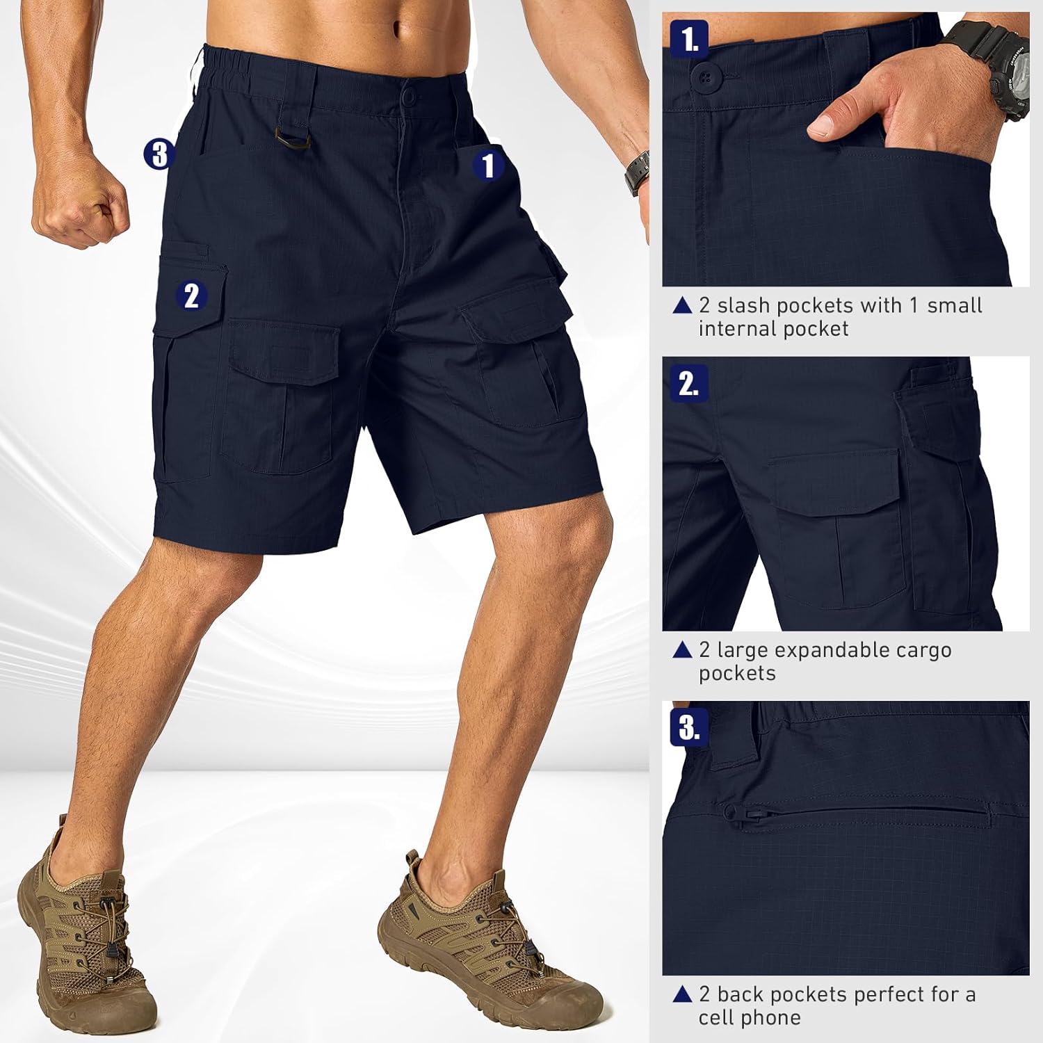 Waterpoof rip stop tactical cargo shorts provides outstanding comfort and performance in almost any outdoor activity, total 8 multi-purpose cargo pockets for various tools and equipment. Great for tactical, hiking, training, working, heavy duty operating, etc