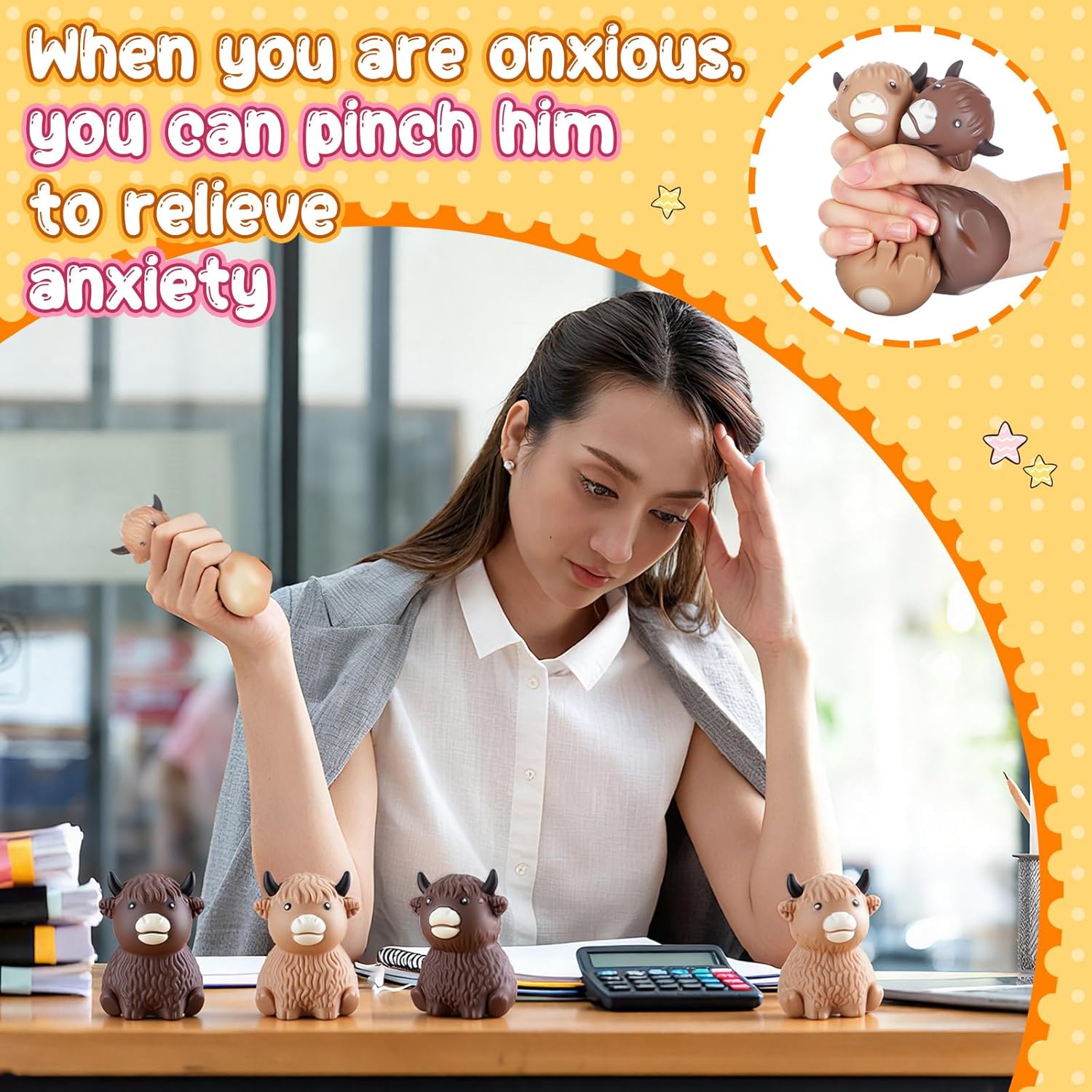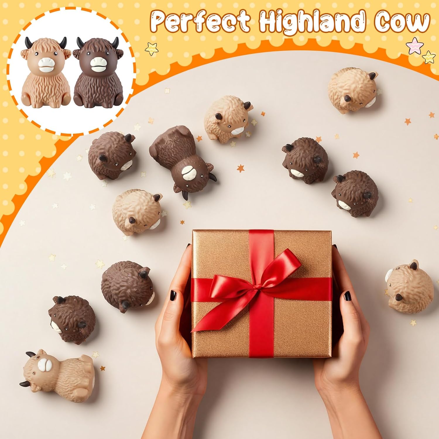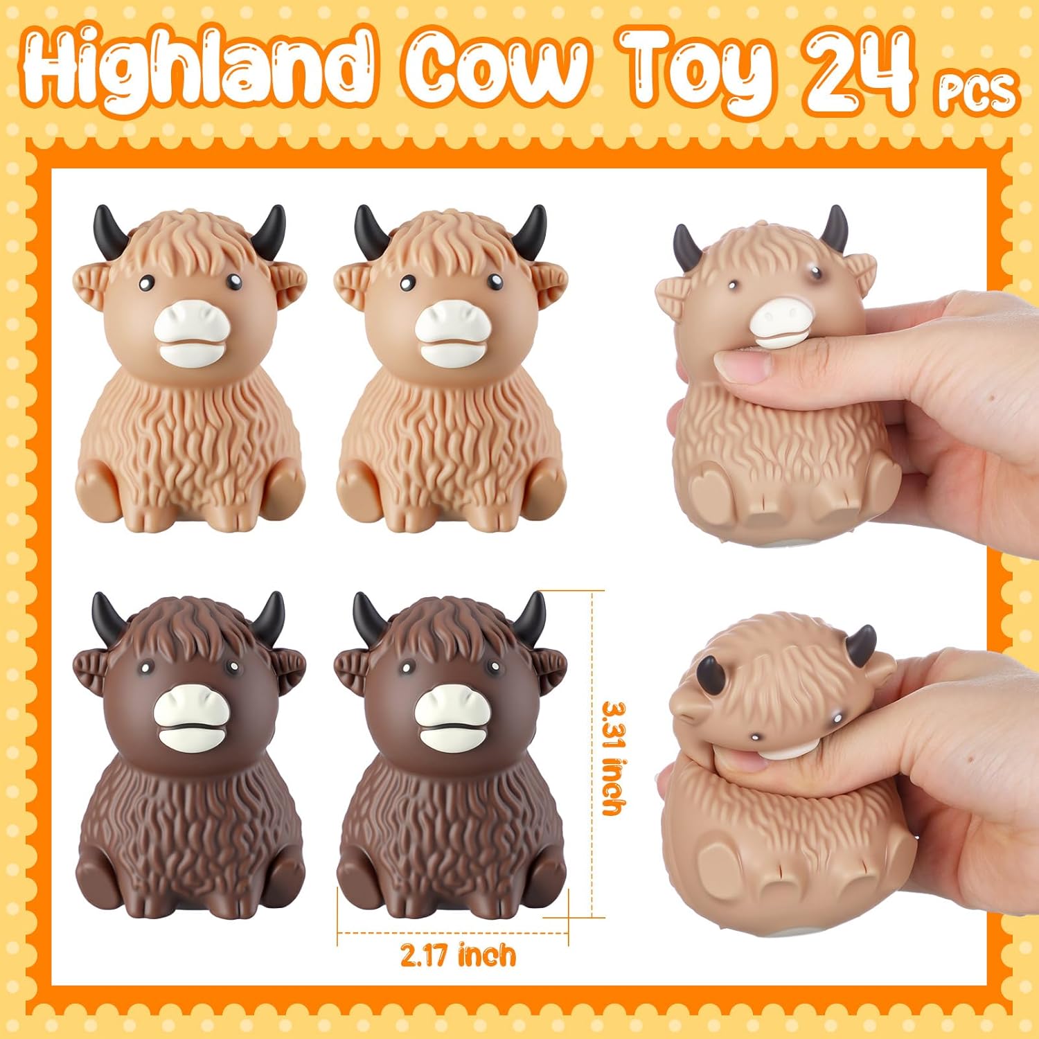 Features: From being a practical stress reliever, these stretchy highland cows can also serve as cute decorations or conversation starters. Doubling as fun, decorative items, these highland cow stress balls are truly multipurpose items, ideal for various settings. Our highland cow stress ball set has two colors, and its advantage of having a large quantity allows you to play it anywhere you want and share it with your good friends Specifications: Material: malt sugar (inedible) Color: brown and khaki Size: 4.33 x 1.97 x 1.97 inches/ 11 x 5 x 5 cm Package includes: 24 x Highland cow stress balls Notes: Manual measurement, please allow slight errors on size. The color may exist a slight difference due to different screen displays