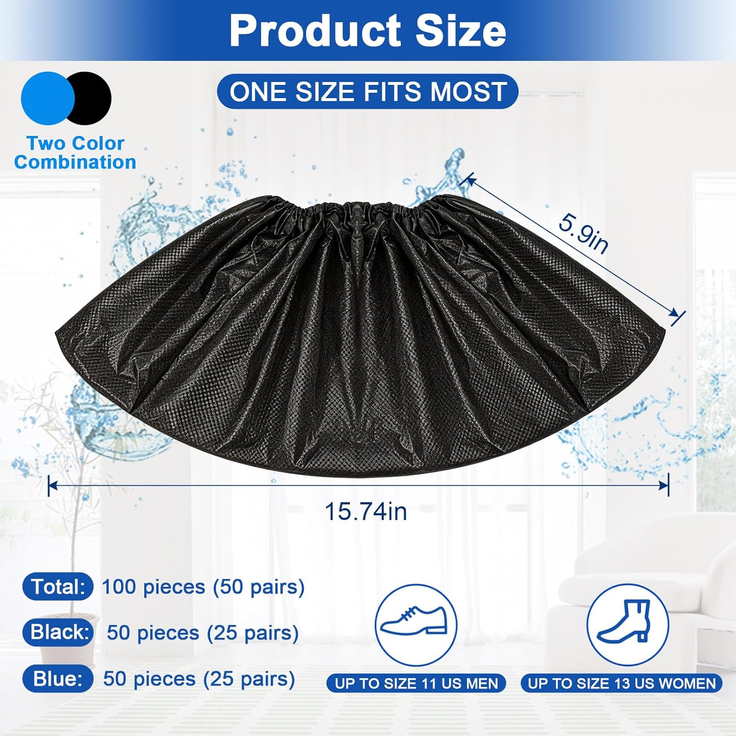 Features: These waterproof shoe covers feature an elastic band. The band stretches to hold the cover in place on the shoe and is designed to fit a range of common shoe sizes. The set includes 100 waterproof shoe covers and two storage boxes. This combination provides a practical quantity of covers with organized dispensers for ready use. Specifications: Material: Plastic Color: blue, black Size: White dispenser box about 6.3 x 7.09 x 3.35 inches/ 16 x 18 x 8.5 cm Package includes: 100 x Shoe covers 2 x White dispenser boxes Notes: Manual measurement, please allow slight errors on size. The color may exist a slight difference due to different screen displays
