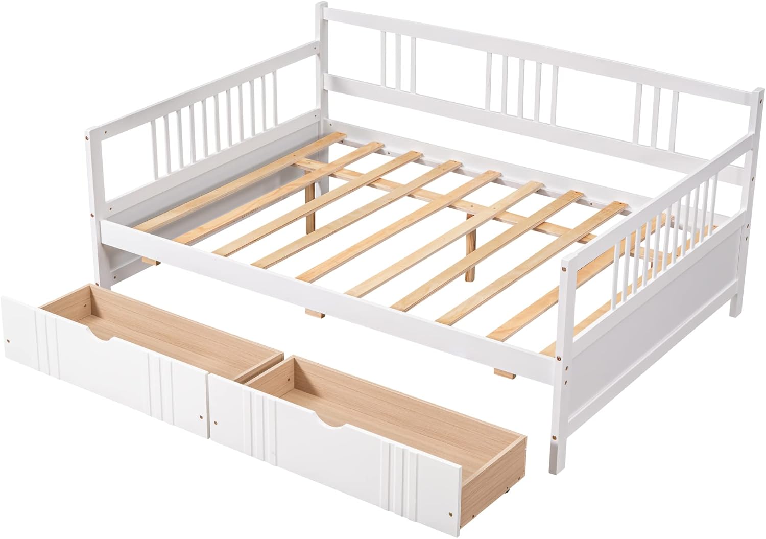 【Solid Construction】Crafted from high-quality pine wood, this Full Size Daybed with Two Drawers boasts a robust frame that is resistant. The sturdy legs, wide boards, and 10 slats greatly enhance the bed's weight capacity, ensuring exceptional stability for years to come.IF there is any problem, please visit our website: Merax.com or contact us via this email: [email protected]【Space-saving Design】With two convenient drawers, this daybed offers ample storage space for books, toys, and other essentials, making it perfect for bedrooms with limited space. Effortlessly create extra room whenever needed, making tidying up a breeze. 【Versatile Multi-functional Design】Not only does this daybed serve as a comfortable bed in your bedroom, but its three-sided railings also enable it to function as a sofa or seat in your living room. This versatile piece of furniture adapts to your needs, providing utmost convenience and comfort. 【Easy Assembly】The package includes all necessary accessories and detailed instructions to facilitate a quick and hassle-free assembly process. Installing this wooden bed frame is a breeze, especially when done by two people. 【Dimensions and Additional Information】 Measuring 78.2"L x 57.5"W x 35.4"H, this full-size daybed offers plenty of sleeping and resting space. Please note that the mattress is not included, and some assembly is required, although we have provided clear instructions to assist you.