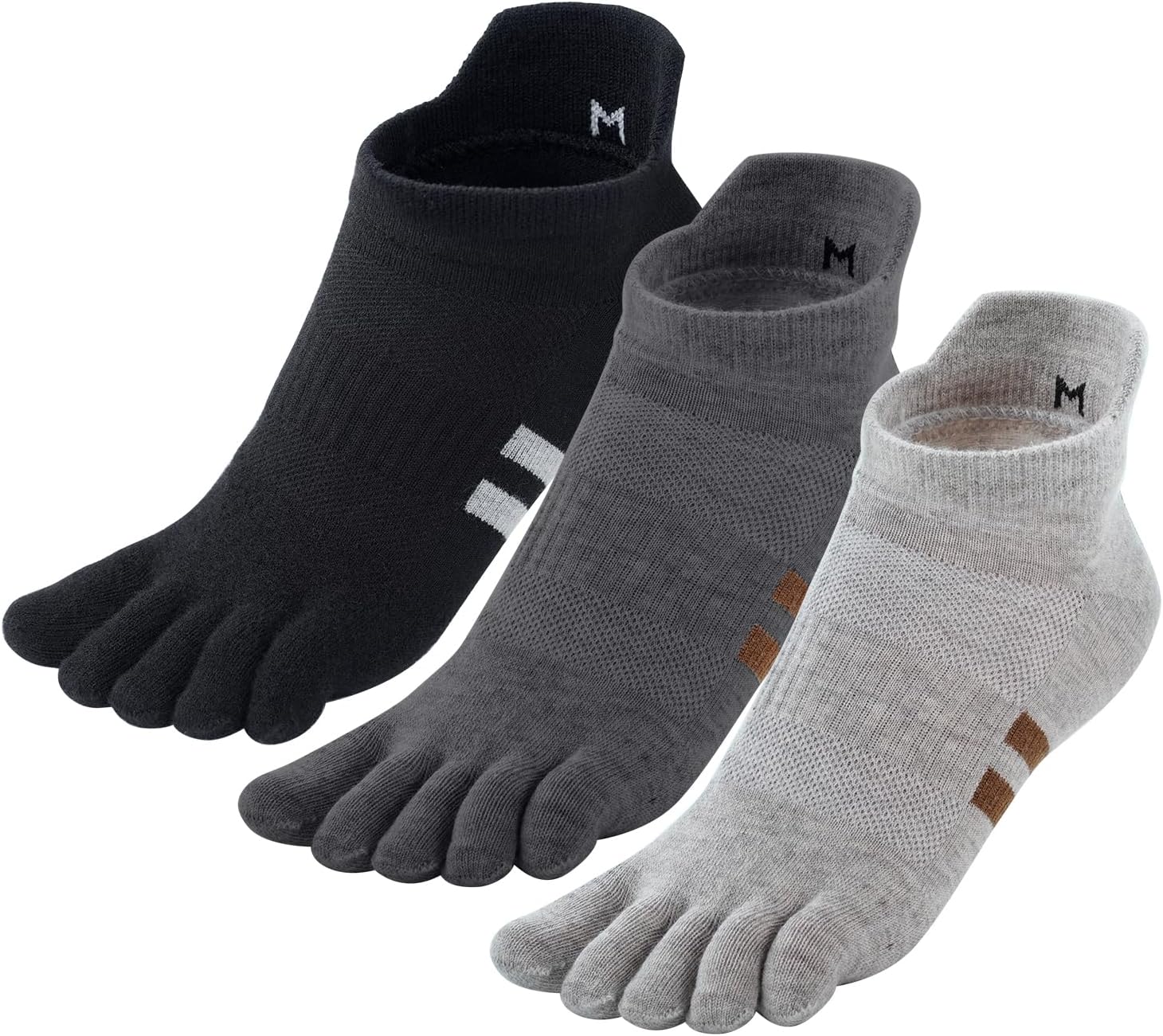 SIZE & NOTICE Medium(Mens: 4 - 8.5/Womens: 5 - 9),Large(Mens: 9 - 11/Womens: 9.5 - 12) Wash inside out with similar colors.The water temperature should not exceed 40°C or 105°F.Please do not iron or tumble dry. Wool socks for men can develop pilling over time due to wool fiber properties and friction.Reduce pilling by following care instructions,minimizing friction,and using a fabric shaver or scissors to remove pills if they form. If you are not satisfied with our products,please contact us immediately,we will give you the best service. Arch Support for Stability These merino wool hiking socks offer extra arch support to help maintain proper foot posture,reduce foot fatigue,and enhance overall comfort and balance,making them ideal for both active days and long hours on your feet at work. ULTIMATE COMFORT Five-Toe Separated Design keeps every step smooth—whether you're running,hiking,or training. Occasions Merino Wool low cut socks can be worn as ankle athletic toe socks,running toe socks,hiking toe socks,fitness toe socks and casual toe socks.When you wear them to play golf,tennis,cycling and walking,they may even help you enhance your performance. When your heart rate rises and sweat kicks in,you need a wool toe socks that support your workout—not slow you down.The wrong pair can cause hot spots,blisters,and damp feet.Ours are form-fitting,breathable,and Lightweight to keep you dry,comfortable,and moving strong. When summer temps say no,these socks say hell-to-the-yes.Our ultra-lightweight no show wool running sock wicks moisture and keeps the air flowing for skin-friendly feet,keeping you dry and cool and your strides blister-free.