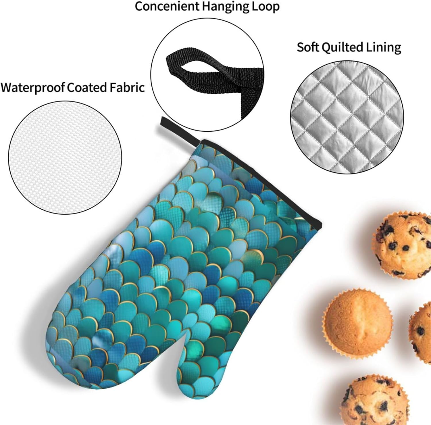 upgrade your kitchen safety with this Mermaid Scale print microwave gloves, oven mitts and pot holders sets. crafted from water repellency polyester and heat-resistant fabric, these kitchen baking three piece set offers reliable protection for hands while handling hot items. the double-layer waterproof design ensures easy cleaning after use. suitable for various cooking scenarios including microwave ovens, conventional ovens, stovetop cooking, and outdoor grilling. the side hanging rope allows convenient storage when not in use. the thick construction provides excellent heat insulation without compromising dexterity. this unisex kitchen essential combines functionality with practical design for everyday cooking needs. the heat-resistant gloves maintain comfort while offering superior protection against burns. an essential addition to any modern kitchen setup
