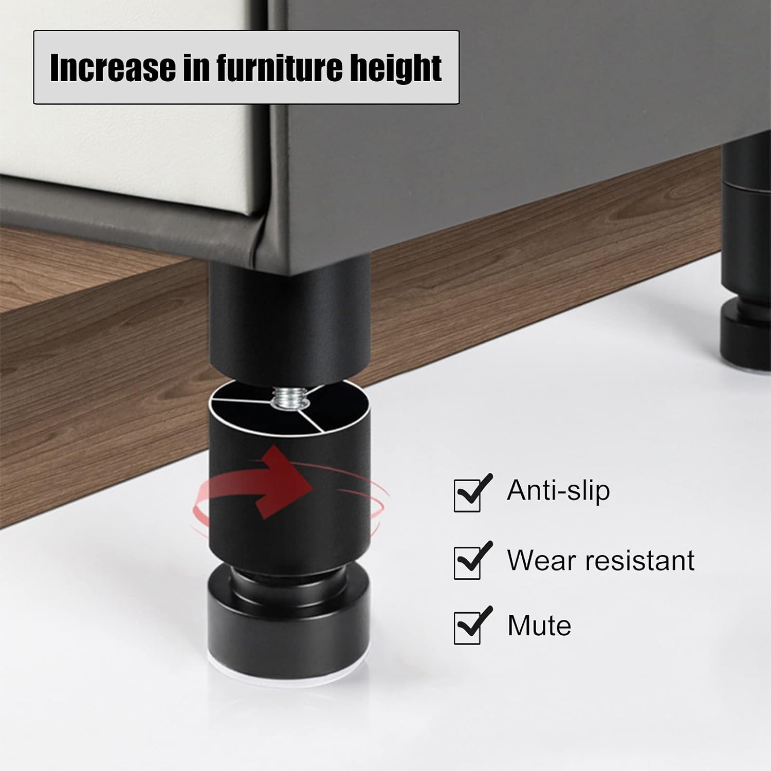 furniture legs with thickened tube walls and internal triangular structure for strong load-bearing capacity to provide safe and stable support for furniture, in addition, the height can be adjusted so that it can be used even on uneven floors.Aluminium alloy furniture legs with electroplated surface treatment, beautiful and fashionable, can match various styles of furniture, waterproof, rust-proof, can be used even in wet environments such as bathrooms and kitchens.metal furniture feet with ABS rubber pads, anti-slip and wear-resistant, can reduce the noise when moving furniture, provide you with a quiet living environment, and protect your floor from scratches.Product parameters. Name: Furniture legs Material: Aluminium alloy Shape: Round Colour: silver, black Size: 6~40cm Applicable places: sofa, bed, bench, coffee table, dining table, office table, bedside table, cupboard, etc. Product Includes: furniture legs x 4Product features. High quality aluminium alloy material, sturdy and durable, strong load-bearing capacity. Electroplating process treatment, waterproof, rust-proof, anti-oxidation Height adjustable, can easily adapt to uneven ground. ABS rubber pad design, non-slip, wear-resistant, silent, no harm to the floor. a wide range of colours and sizes, suitable for most styles of furniture.100% satisfaction. We are committed to providing the best quality service to every customer, after receiving the product, if the product has quality problems or does not meet your expectation, please contact us first, we will give you a satisfactory solution.