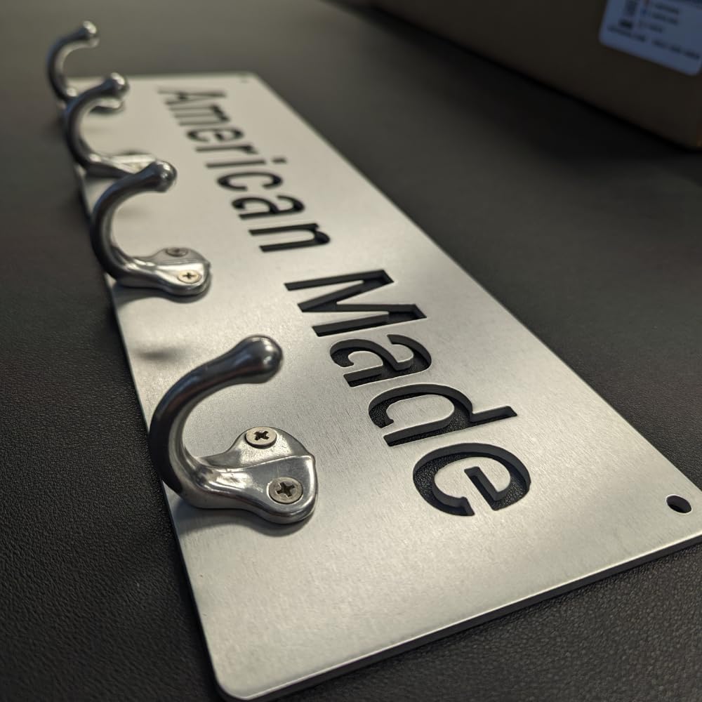 This 16" brushed aluminum hook sign comes with 4 accessory hooks. This beautiful decorative piece is the perfect addition to any garage. These hooks are perfect for hanging kitchen essentials such as pot holders, cooking utensils, hand towels, etc.