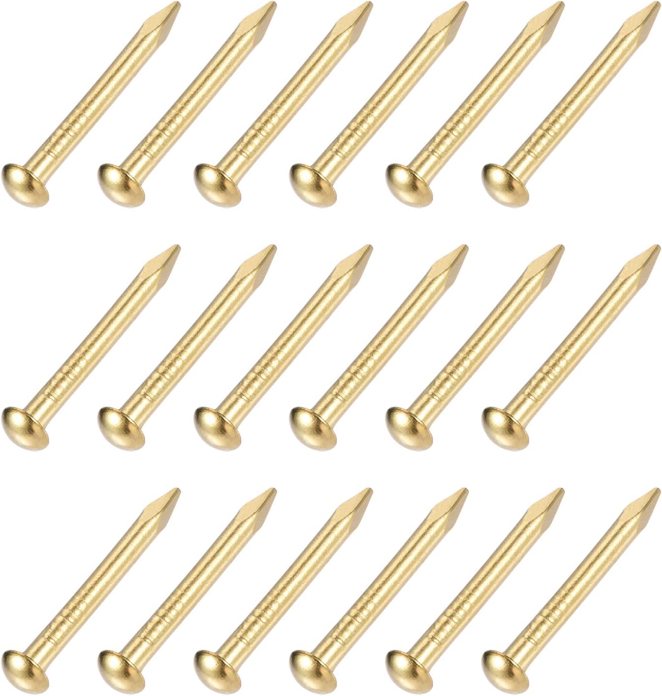 APPLY TO - Small hardware nails are suitable for household woodworking, such as wooden doors, ordinary cabinet doors and other surface panel hinges fixed installation, can also be used for DIY handmade wood products, such as wooden boxes, wooden handicrafts, etc. Not for hard walls.SPECIFICATION:Material: Carbon SteelSurface Finish: Copper PlatedTotal Length: 15mm /0.59-inRod Diameter: 1.5mm /0.06-inHead Diameter: 3mm /0.12-inQUANTITY INCLUDED - 60pcs x Small Tiny NailsADVANTAGE - The tiny nails are made of brass, rust and corrosion resistance, high hardness, and good penetration.INSTALL - There are some small textures on the nail rods to increase friction and prevent loosening and falling off after installation. When using the small nails, try to choose a rubber hammer, do not hammer it hard, need to tap into the object with a balanced force.