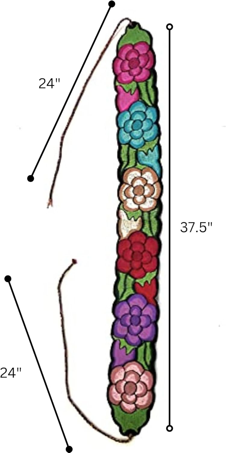Mexican Floral Belt. Embroidered Belt. Mexican Belt. Belt from Mexico Measurements: Length : 36" Straps: 20” (each) Width: 4” Total Length: 75" all approx as each are hand made individually. This beautiful Mexican embroidered belt is a beautiful piece to add to your wardrobe! This wrap around style belt is a one size fits most! Perfect piece for a unique look. Will look great with our Mexican Blouse from chapas!