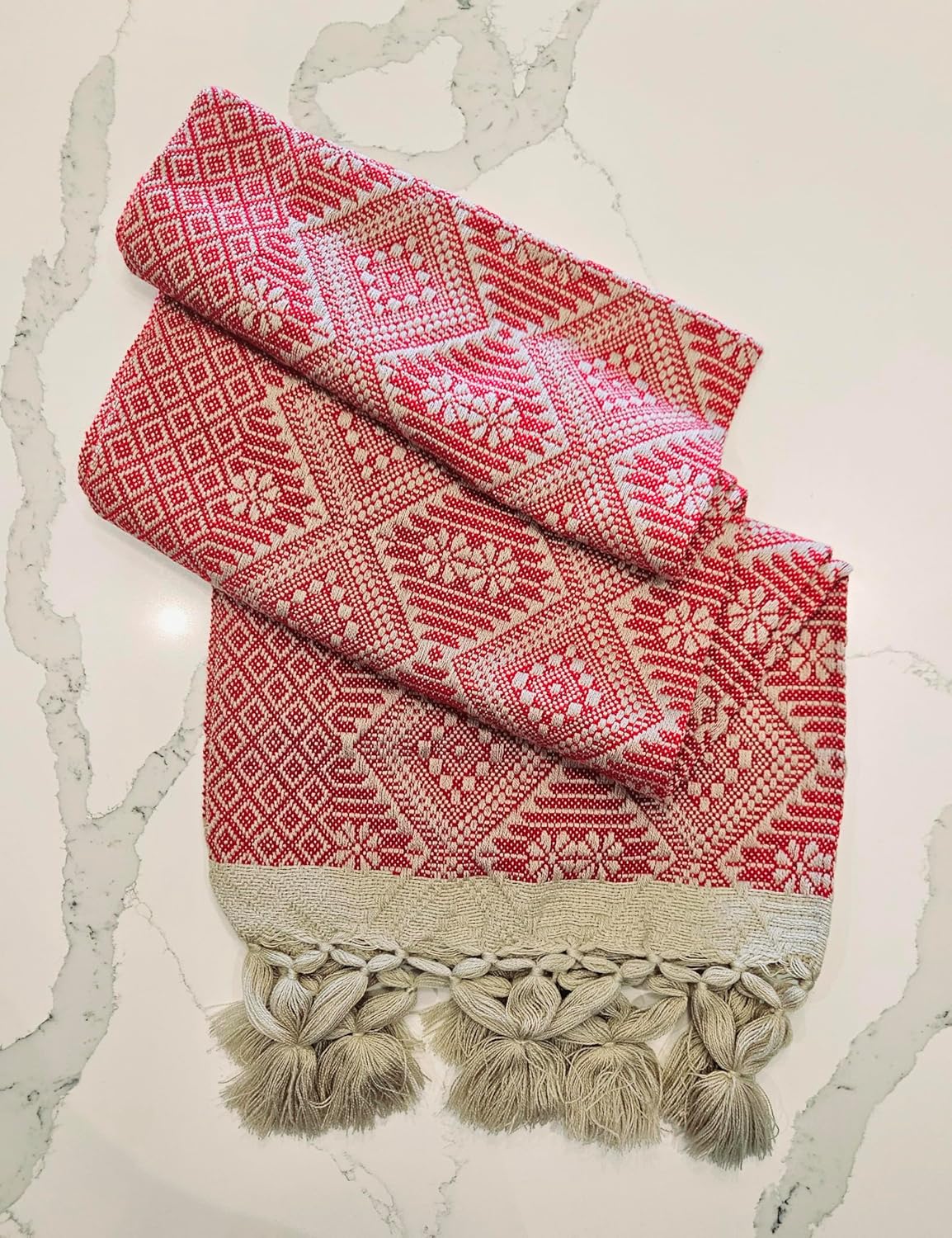 A rebozo is a traditional Mexican cloth which looks like a cross between a scarf and a shawl. Like ponchos, huipils and sarapes they are classic Mexican garments. A rebozo is long enough to wrap around a woman's body and can be used in pregnancy and labour by midwives or doulas. Because of the nature of the garment, especially the fringes, they should be hand washed. The dye may or may not be colorfast so mild soap should be used
