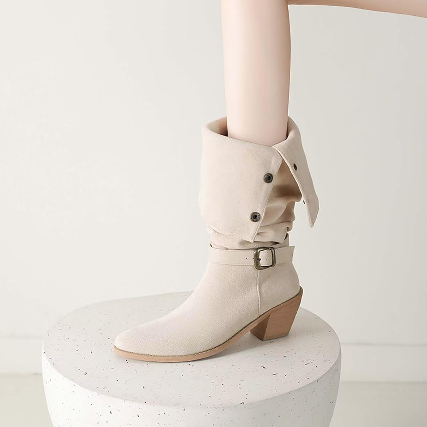 Block heel buckled boots, can be worn in many ways. Super comfortable, feet will not hurt with long standing or walking. Soft material, no bad smell.