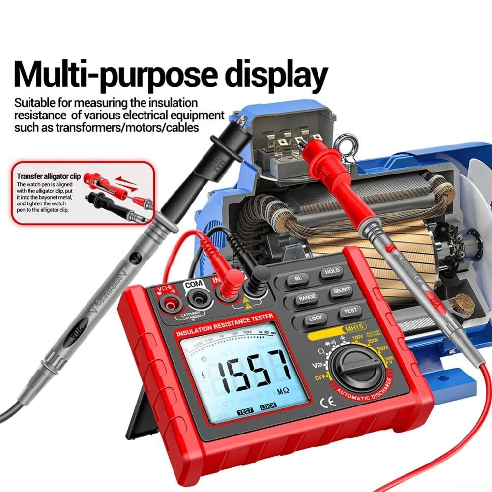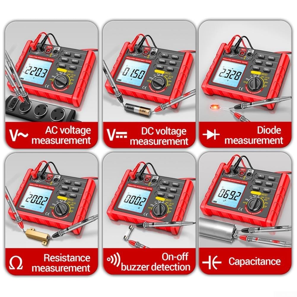 Features: This instrument is a battery powered insulation resistance tester that can be used to measure DC voltage, AC voltage, resistance, continuity, diode and insulation resistance. When measuring the insulation resistance, there are four test voltages to choose from: 100V, 250V, 500V and 1000V. It has polarity indication, over-range indication, data lock, auto lock and other functions. It is easy to use and is a precision measuring tool. - Digital Megohmmeter: MH15 is a high quality digital megohmmeter that performs accurate insulation resistance tests, easily switching between 100/250/500/1000V with up/down buttons - Material: Made of sturdy polypropylene, this megohmmeter is designed to withstand the rigors of regular use while maintaining its accuracy and reliability - Large LCD display and easy control: Soft buttons are easy to use and the large LCD display with backlight allows you to view the measurement at a glance even in dark environments - Insulating Resistance Meter: This digital insulation resistance tester features automatic voltage release, high stability and reliability, and a maximum count of 6000 times - Solve practical problems: The megohm tester is suitable for measuring the insulation resistance of various electrical equipment and insulating materials, such as motors, cables, switches, household appliances. It is suitable for maintenance, repair, testing. Specifications: Part Name: Resistance Tester Material: ABS Dimensions: 168 x 132 mm / 6.61 x 5.20 inches. Colour: Red Box contents: 1 Megohmmeter. 2* for alligator clips 2 x Test Leads 1 x Manual 1 x packaging