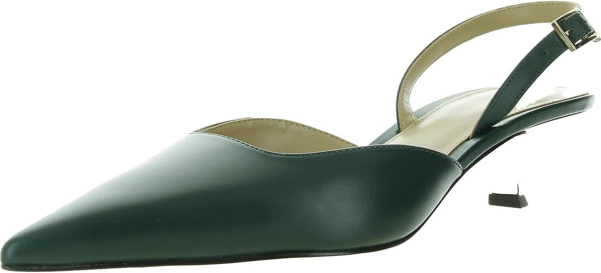 On trend slingback squared point toe pump on a kitten heel is a statement piece with fashionable kicked-in heel design.