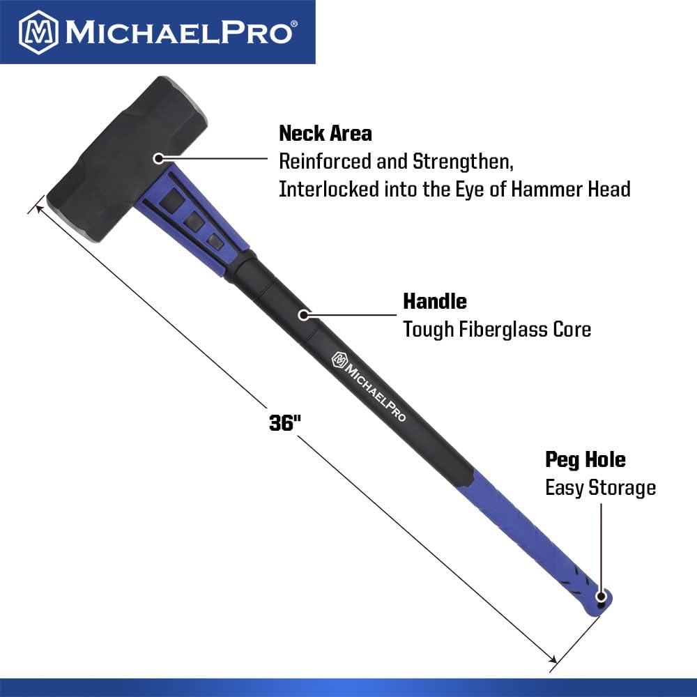 【PREMIUM HAMMER HEAD】MichaelPro’s 8 lbs Sledge Hammer is made of 1045 Heavy Duty Steel with a HRC of 45 - 60 and is then finished with a rust-proof coating to withstand tough environments. 【ULTIMATE SHOCK ABSROPTION】The 36-inches handle is made of tough and weather-resistant Fiberglass and coated with a textured, slip-resistant rubber for that ultimate impact absorption when you make perform precise and/or powerful, repeated hammerings on any objects. 【REINFORCED HAMMER NECK TO PREVENT DISLODGING】The neck area of our Sledge Hammers are reinforced and strengthen specially to prevent hammer heads from dislodging. 【PERFECTLY BALANCED】The hammer handle features a perfectly balanced point that is close to the hammer head that gives an ideal weight distribution and high swing speed. Its handle is interlocked into the eye of the hammer head. 【EASY STORAGE】The bottom of the handle has an peg hole specially for easy storage.