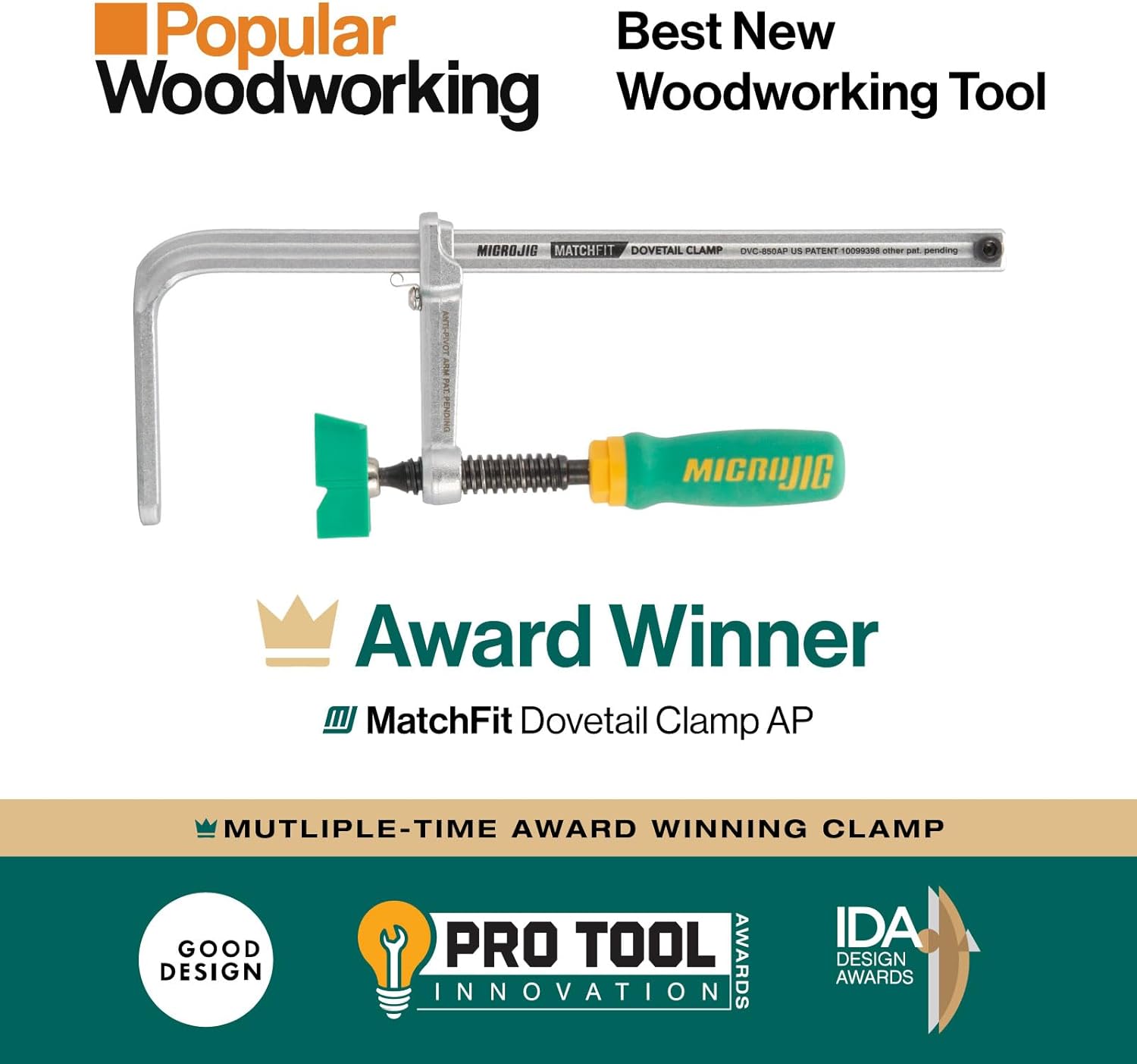 Introducing MATCHFIT Dovetail Clamp AP by MICROJIG, the newest and most expansive clamp to the MATCHFIT system. The MATCHFIT system already set the woodworking world on fire with it's patented dovetail clamp track process. With just a standard 14° by 1/2" dovetail router bit, you can route your own clamp tracks and get the hold-down pressure where and when you need it. The clamp arm matches this same profile and smoothly slides into the dovetail groove where it's out of the way of your operation and cutters. The New AP builds upon this system by giving you an 8.5" clamping capacity for your larger projects. It also comes with the dynamic X-Pad accessory, which offers you 2-in-1 hold-down and inline clamping pressure. The X-Pad works with your downward pressure and torque to apply inline pressure without lifting the material off the flat work surface like traditional inline clamps. Inline and hold-down pressure is essential when doing glue-ups and assembly projects. The AP introduces Anti-Pivot Technology, which keeps the clamp up and in a fixed position when changing out material during repeat assembly projects. The AP prevents the clamp from unintentionally dropping-down and getting in the way of your workflow. You'll enjoy faster and frustration-free clamping all over your shop. MATCHFIT Dovetail Clamp AP gives your limitless possibilities for building jigs like never before and eliminating expensive T-Track. Dovetail tracks are powerful and much more versatile for setting up hold-down clamps. Upgrade and optimize your shop with dovetail clamp tracks and get more creative control with the latest innovation from MICROJIG. Designed in the USA. Made in Taiwan. 100. backed by MICROJIG. Patent Pending.