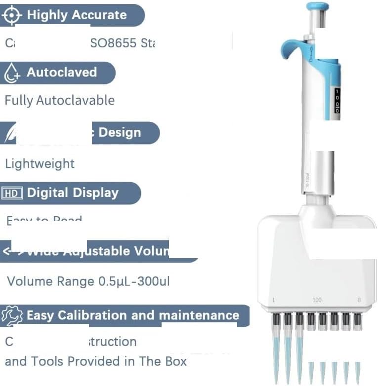 Description:Ergonomic & Lightweight Design Designed for user comfort with minimal press force and a moderate press stroke The ergonomic finger rest helps reduce hand fatigue while the handle offers a secure and comfortable grip.4-Digit Volume Display High-resolution digital display ensures precise and clear volume readings for reliable liquid handling.Volume Lock Mechanism Prevents accidental volume changes during pipetting, enhancing reproducibility and accuracy.360° Rotating Head Allows full 360-degree rotation for flexible operation in tight spaces and multi-well formats.Fully Autoclavable & UVDisinfectable Entire pipette is autoclavable for hightemperature, high-pressure. It is also compatible with UV disinfection and easy to disassemble for thorough cleaning.Elastic Nozzle Technology Securely fits pipette tips with a light touch-no need for repeated tapping. Ensures tight sealing and reduces ejection force for consistent multi-channel performance.Superior Channel Consistency Delivers strong repeatability and uniform performance across all channels, for high-throughput applications.