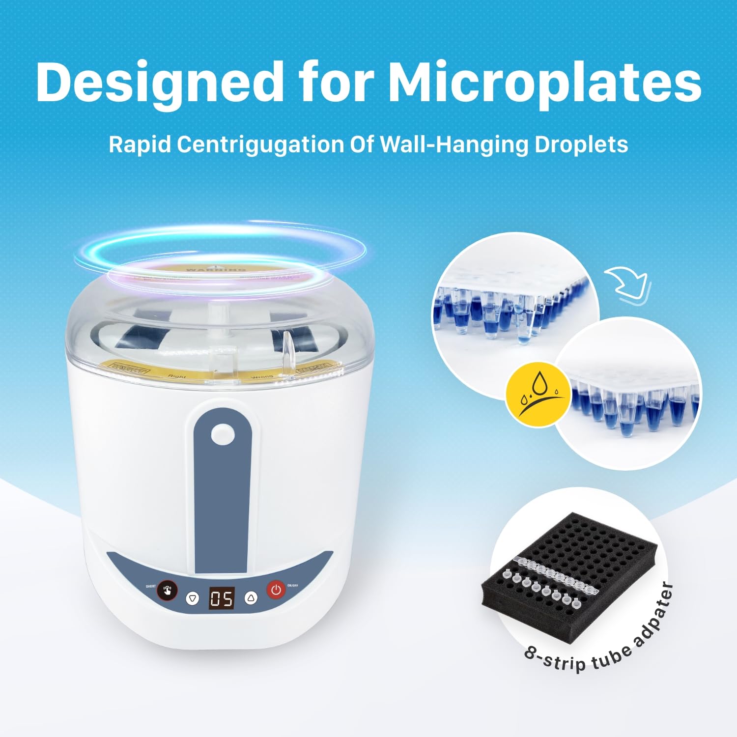 VISOSCI Microplate centrifuge is a transient centrifuge specially designed for 96-well microplates.The small amount of liquid can be kept at the bottom of the microplate under the action of surface tension without worrying about the liquid leaking from the wells. In order to keep the environment cleanplease seal the microplate with sealing film,and load the microplate vertically from the groove on the top of the centrifuge(the bottom of the tube facing outward), so that the liquid hanging on the wells can be instantly drop into the bottom.Suitable for 96-well or 384-well and other standard PCR microplates. Widely used in transient experiments after PCR sample loading.