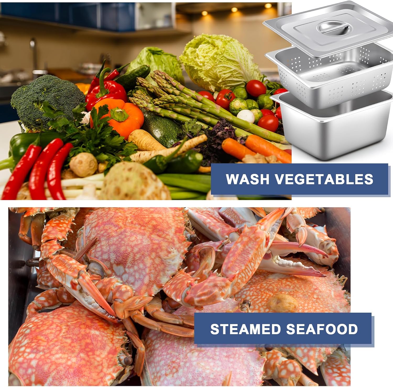 Features: Hotel pans with lids: No more messy splatters or dried-out meals, our hotel pans come with fitting lids that seals in flavors, ensures steam retention, and keep your food fresh and warm. Cooking needs: Featuring a stainless steel composition, these silver hotel pans can easily withstand constant use and high heat without compromising on its durability, this makes them a suitable addition to your kitchen, whether you run a busy restaurant or an intimate kitchen. Specifications: Material: stainless steel Color: silver Size: Hotel pan: about 12.9 x 10.4 inches/ 32.7 x 26.4 cm and 4 inches/ 10 cm in height Perforated pan: about 12.9 x 10.4 inches/ 32.7 x 26.4 cm and 1.9 inches/ 5 cm in height Hotel pan cover: about 12.9 x 10.4 inches/ 32.7 x 26.4 cm Package includes: 2 x Hotel pans 2 x Perforated pans 2 x Hotel pan covers Notes: Manual measurement, please allow slight errors on size. The color may exist a slight difference due to different screen displays.