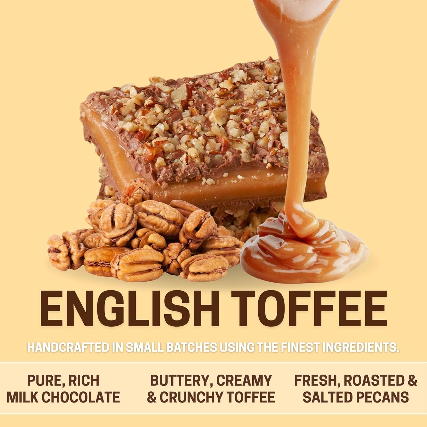 English Toffee is a top selling treat and our special recipe stands the test of time. Crunchy, butter-rich toffee sandwiched between layers of milk chocolate and fresh roasted pecans, who could ask for more? Each batch is handmade and packaged.
