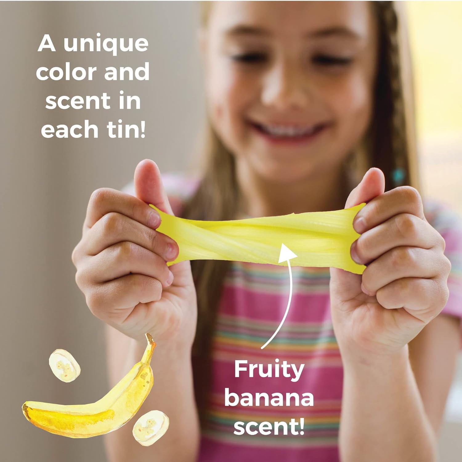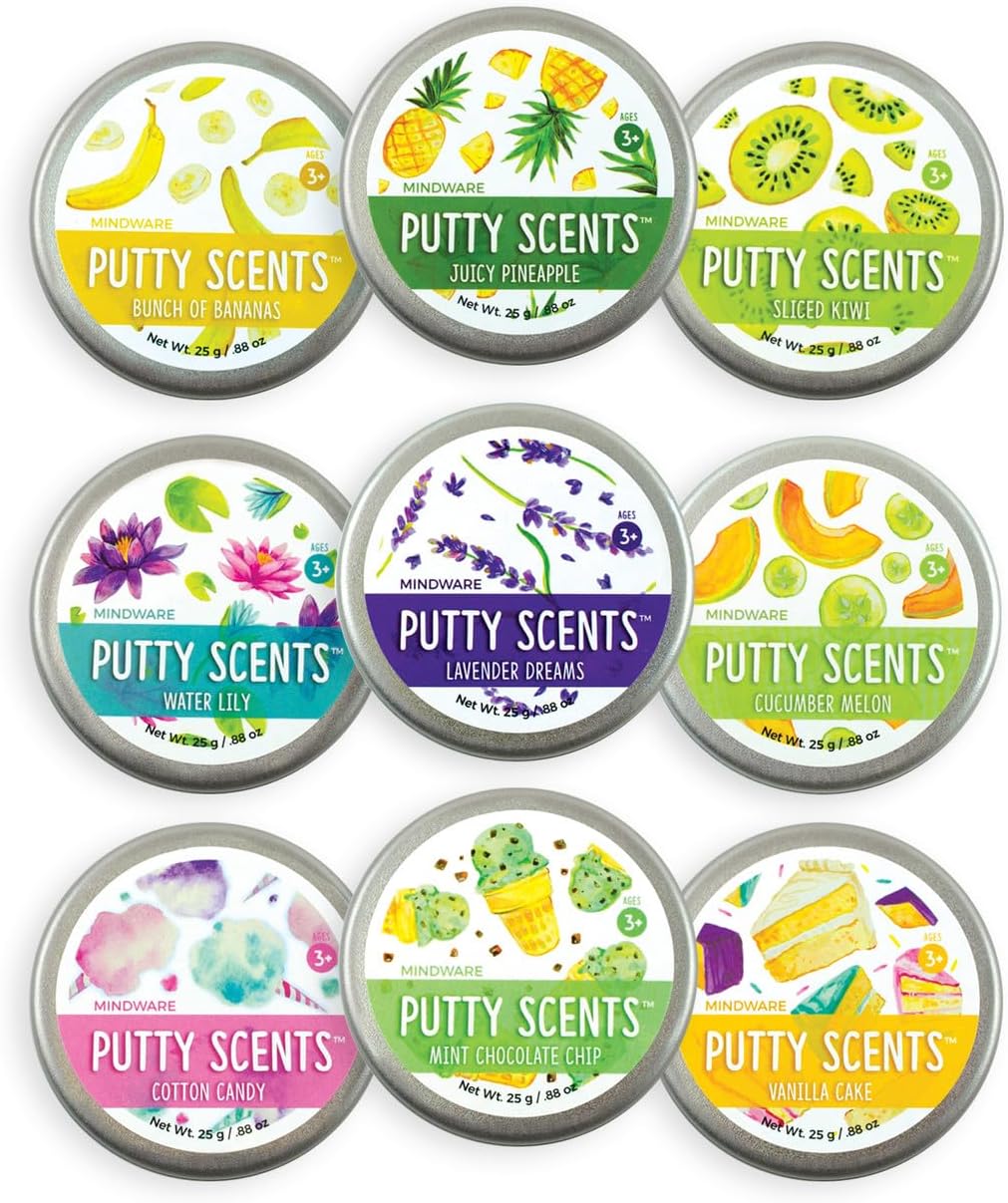 Putty Scents is an irresistible kind of playful putty with delightful scents! Each tin contains unique colors and smells with nearly two times the amount of putty when compared to similar mini tins! Our soft and pliable putty is the popular sensory tool that's great for kneading, molding, stretching and mixing, with unique aromas in each set! Each tin contains 25g/.88oz of scented putty. Contains a total of 36 tins, 4 of each scent: Bunch of Bananas Cotton Candy Cucumber Melon Juicy Pineapple Mint Chocolate Chip Lavender Dreams Sliced Kiwi Vanilla Cake Water Lily Gluten-free
