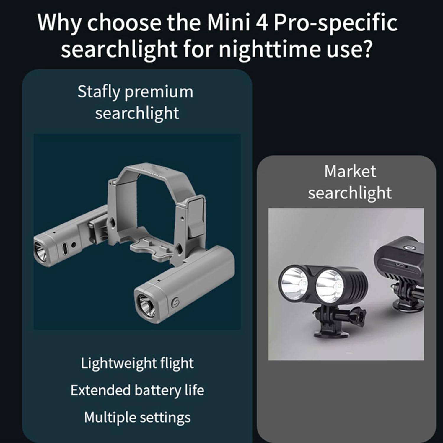 Specifications:Material: ABSColor: GraySize: 122.3x 71x 60mmWeight: 113gQuantity: 1 SetApplicable Model: for DJI Mini 4 ProPackage:1x LED Searchlight (Integral) + 1x Charging Cable + 1x InstructionNote:Only the above package content, does not include other accessories