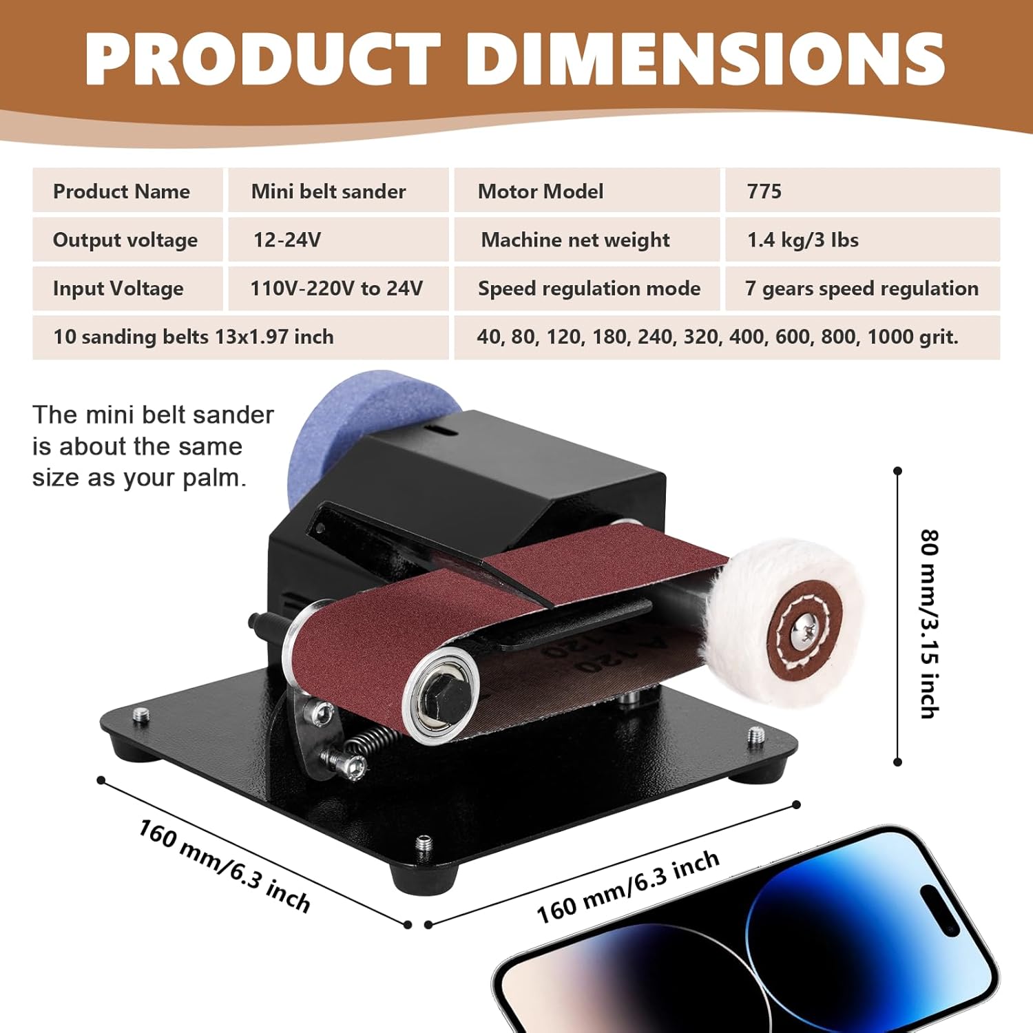 | Included Components | Mini Electric Belt Sander x1, 300x50mm Sanding Belts x10, Hex Wrench x2, 7-Speed Adjustable Power Supply x1, Buffing Wheel x1, Grinding Wheel x1, Plastic Desktop clamp x 1 |
