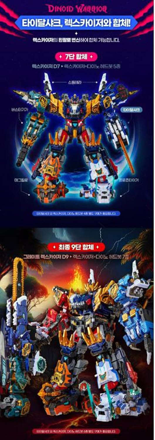 This New version Dinoid Warrior TIDAL SHARK is Blue Shark Transforming Robot can be transformed to Robot mode, Head mode and combination mode for Rex kaiser(Weapon part). It can be combined with Rex kaiser(Sold separately) for Great Rex Kaiser D7 or Complete form D9 Comes with Stand for play map. Includes TIDAL SHARK, Dino coin, Play map box, Wave saw, Wave launcher, Manual Box & Manuals are written in Korean language.