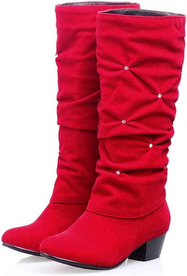 Women's Fashion Slouch Mid Calf Riding Boots With Rhinestone Round Toe Suede Cozy Low Heel Dress BootsSize Chart:Size 4 US = EU34 = Heel to Toe 22.0cm/8.66"Size 4.5 US = EU35 =Heel to Toe 22.5cm/8.86"Size 5 US = EU36 = Heel to Toe 23cm/9.06"Size 6 US = EU37 = Heel to Toe 23.5cm/9.25"Size 7 US = EU38 = Heel to Toe 24cm/9.45"Size 8 US = EU39 = Heel to Toe 24.5cm/9.65"Size 8.5 US = EU40 = Heel to Toe 25cm/9.84"Size 9 US = EU41 = Heel to Toe 25.5cm/10.04"Size 10 US = EU42 = Heel to Toe 26cm/10.24"Size 11 US = EU43 = Heel to Toe 26.5cm/10.43"Use your length and width measurements to find your shoe size on the above size chart. If your foot is fat or wide, please select a bigger size up.PERFECT ITEM FEATURES:☛Item Type: Mid Calf-boots☛Main Material: High Quality Vegan Suede upper; Comfort Velvet Lining; Non-skid Rubber sole.☛Closure_type: Pull-On☛toe_style: Round toe☛Heel Height: Heel Height 2.36 inch☛Width: Medium (BM)☛Season: Spring/Autumn/Winter☛Color: Multiple colors optional☛Occasion Lifestyle: Fashion,Classic,Casual.☛ ☛
