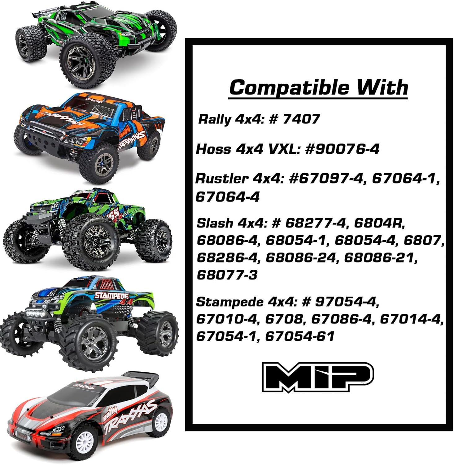 #18140/ 10130 - MIP x-duty, rear, 1/10 scale Traxxas Slash/Stampede/Rustler/Rally/monster truck 2WD/ 4WD, electric/nitro, CVA drive kit advantages: unique and strong splined steel construction. Designed for ultimate durability for those overpowered vehicles fully buildable so any damaged or worn part can be replaced. (Scroll down on main part # and all rebuild components are there) Pro tips: use MIP grease and MIP blue thread gel upon assembly. Be sure to keep joints lubed to enjoy long part life Features: Made from high grade carbon steel keyed 12mm hex standard heat treated steel components to help increase strength and part life. Black Oxide coated to protect the components from premature rust. 100% designed/ manufactured/ packaged in the USA!!! Includes: complete rear xduty driveline special note: this 18140 /10130 kit features a tweener bone and updated hubs unlike that seen in past kits so it makes it unique that it can fit most If not all of popular 1/10 scale 2WD and 4x4 Traxxas vehicles that feature the same hubs and arm lengths including the 2WD and 4WD Slash, Stampede, Rustler, Rally, and monster truck both in electric/nitro compatible version. This kit replaces that of MIP #11104, #11106, & #11109