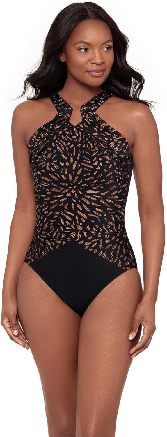 Aphrodite may be the goddess of love, but you'll be channeling a sea goddess the moment you slip into this visually stunning swim style from Miraclesuit. The high halter neckline is eternally flattering, with an adjustable strap that guarantees the absolute perfect fit for your unique figure. Shirring in the midsection conceals excess pounds and delivers a slimmed down figure with that enviable hourglass shape. Our exclusive Miratex® fabric functions like magic, whittling down your waistline in a snap. You'll regret missing out on this otherworldly swimsuit, so add it to your swim collection today. What is The Miracle? "Look 10 lbs. lighter in 10 seconds” is more than just a tagline – it’s a promise. Our unique and innovative Miratex® fabric delivers three times the control of ordinary swimwear fabrics while remaining totally comfortable and allowing full range of motion. There are no panels or linings – just slimming, slenderizing control for all over shaping you need to see to believe. All Miraclesuit swimwear features sophisticated prints and sleek, contemporary styling that’s on trend and totally timeless. At Miraclesuit, we believe in curves. Strategic draping and shirring create an hourglass shaped silhouette, which helps highlight your best features. This swimsuit is made for any body type and flatters every unique figure. When a woman wears her Miraclesuit, she feels confident and beautiful both inside and out. Miraclesuit is created like no other swimsuit in the world. Try it on once and you'll love it forever, guaranteed.