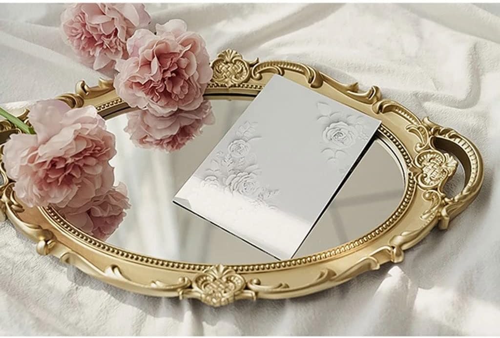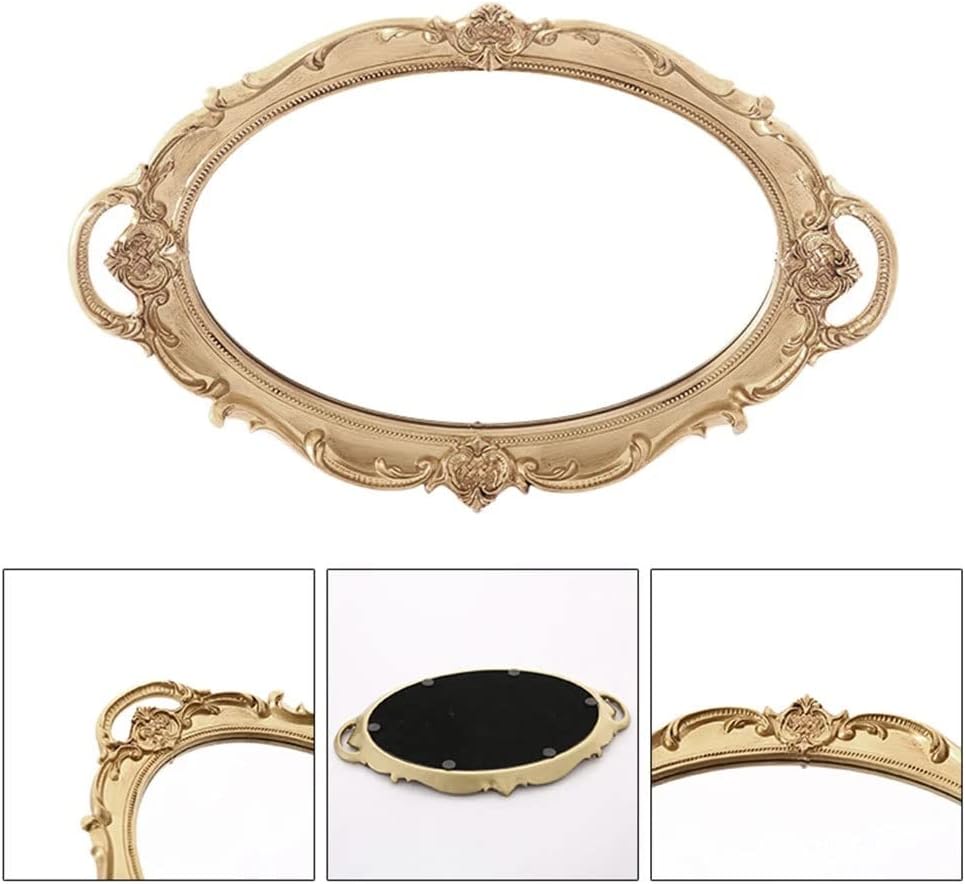 Multi-purpose: Jewelry trays are very suitable for display and organization, jewelry, cosmetics and perfumes.Use as a wall-mounted mirror: This mirror holder can also be used as a wall-mounted mirror on the wall of a bathroom or bedroom.Application: This dressing tray jewelry tray can be placed on the bathroom sink, living room, coffee table, bedroom dressing table, etc. to reflect your taste in life.It is an elegant gift for weddings, anniversaries or any special occasions.Reduce clutter and save desktop space.Specification:material: plasticDimensions: 37x25x2.3 cm/14.57x9.84x0.91 inchesThe package includes:1-piece vanity mirror trayDecorative Tray PU Leather with Brushed Gold Stainless Steel Handle for Coffee Table, Ottoman, Console Table