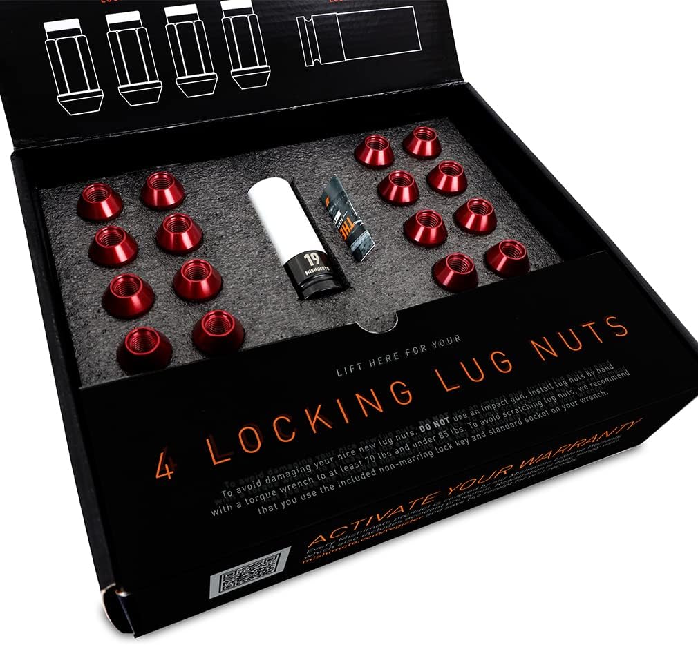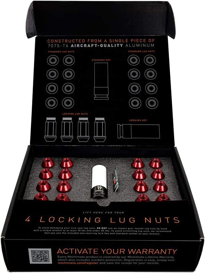 Upgrade your vehicle’s styling with a set of Mishimoto Aluminum Locking Lug Nuts! These M12x1.5 aluminum lug nuts are constructed from a single piece of 7075-T6 aircraft-quality aluminum and are the perfect complement to both stock and aftermarket wheels. These lug nuts weigh in at just 0.8 oz (22.68 g) each and provide a lightweight yet durable alternative to your stock lug nuts. Each kit includes 16 standard lug nuts, 4 locking lug nuts, one non-marring socket, and one non-marring key. These non-marring sockets are lined inside and out with soft plastic to protect both your wheels and your Mishimoto lug nuts.----These lug nuts utilize an open-ended design with a total length of 50 mm, conical seat to fit many OEM and aftermarket wheels, and a knurled end for speedy installation. These Mishimoto aluminum locking lug nuts fit vehicles with M12x1.5 wheel studs and come in a variety of finishes including black, blue, neo-chrome, silver, or red. As with all Mishimoto products, these lug nuts include the Mishimoto Lifetime Warranty.