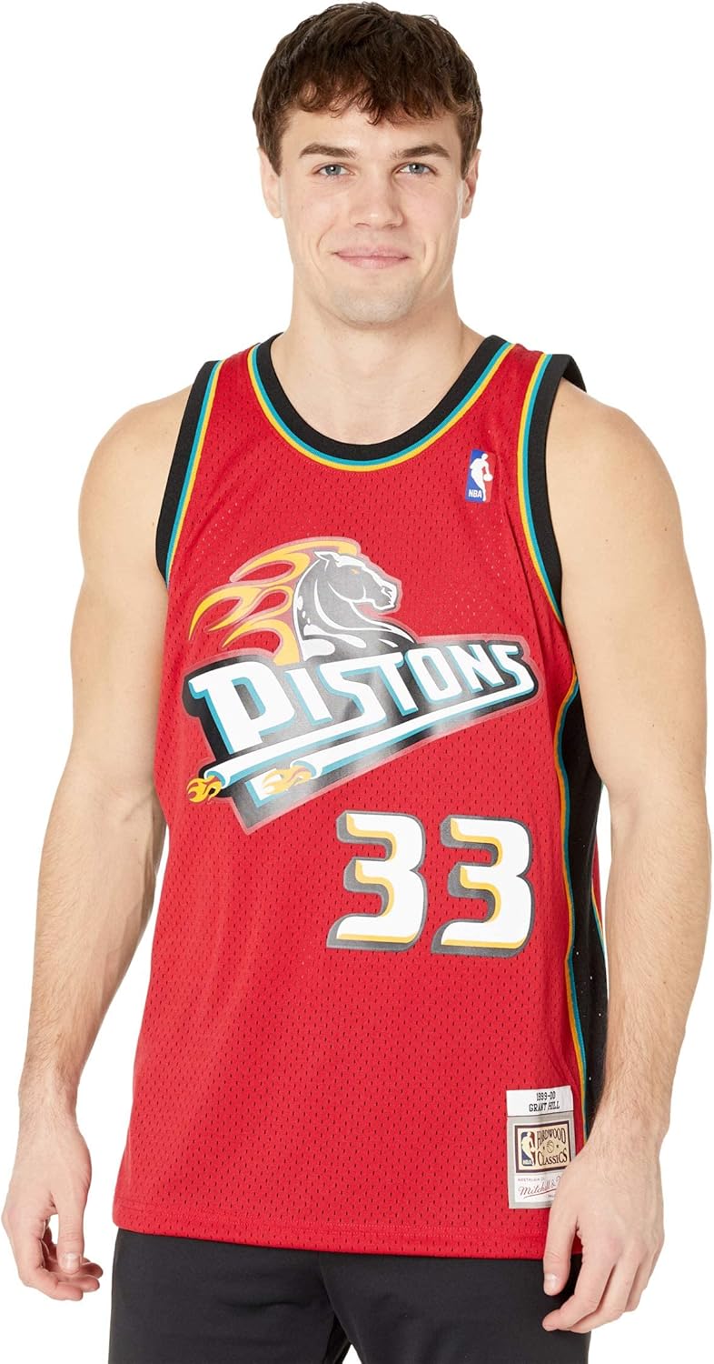 This is a Grant Hill Detroit Pistons 1999-00 alternate men's red Swingman jersey. Made by Mitchell & Ness, this jersey has heat sealed graphics, player name, and number. Fits true to size. Officially licensed.