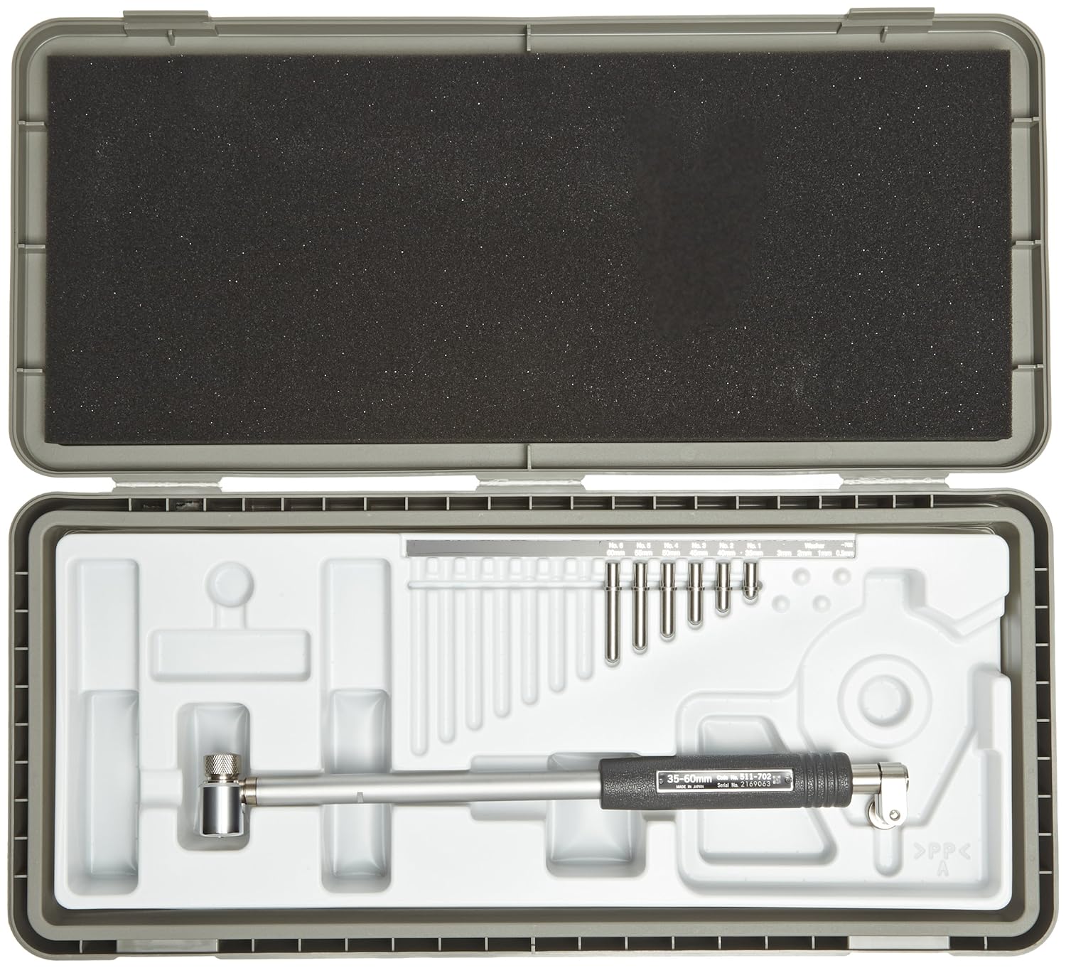 The Mitutoyo 511-702 Bore Gauge without Indicator has a measurement range of 35 to 60 mm. The grip reduces the influence of heat from the operator's hand during use to retain high-accuracy measurement. This gauge uses a two-point contact system for the detection of geometry problems such as ovality and taper, and carbide-tipped contact points provide extended wear and improved abrasion resistance. This gauge is for use with Mitutoyo dial indicators (sold separately).Bore gauges measure holes, or bores, in a workpiece. They can measure the interior diameter of a hole at any depth, while internal micrometers can only measure to the depth of their teeth. Bore gauges are typically calibrated with a setting ring and come in two types: simple and direct-measuring. Simple bore gauges are used with a caliper to transfer the hole measurement, while the more complex gauges take the measurement directly, and display it through a vernier, dial, or digital display. Bore gauges have a two- or three-point contact, indicating how many points on the gauge head touch the inside of the bore. Two-point contacts are better at measuring ovality, while three-point contacts are used to measure lobing or triangular form error. Pistol-grip bore gauges are used for fast, single-handed operation with repeatable results from one operator to another. Bore gauges can also be used in special applications, such as measuring threads, spline pitch diameters, and deep bores.Mitutoyo manufactures precision measuring tools, metrology equipment, and related systems. The company, founded in Tokyo in 1934, formed Mitutoyo America Corporation in 1963 with headquarters in Aurora, IL.