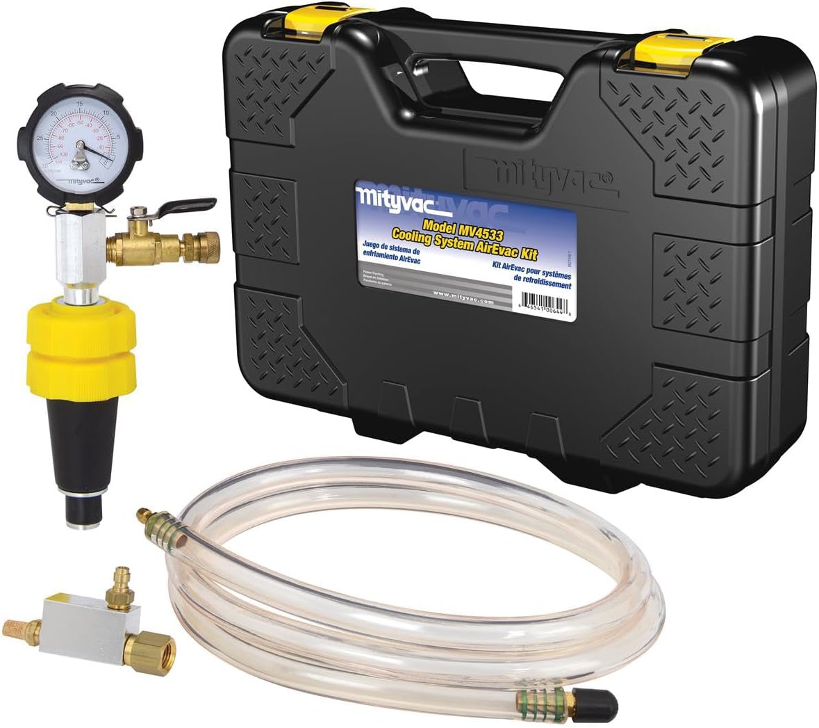 The Mityvac MV4533 Cooling System AirEvac Kit is engineered to refill automotive cooling systems efficiently. It features a universal adapter replacing over 20 adapters, fitting diverse vehicles from cars to heavy-duty trucks. Utilizing a compressed-air-operated venturi vacuum, it quickly eliminates trapped air, allowing for precise leak testing and hassle-free coolant introduction. A large 2-1/2 inch gauge with test zones enhances accuracy in diagnostics. The kit contains a patent-pending airtight cam mechanism, a push-button valve for safe pressure release, and is housed in a durable case for easy portability.