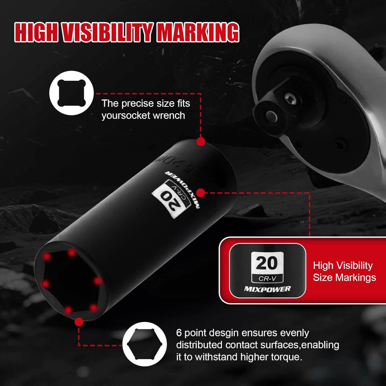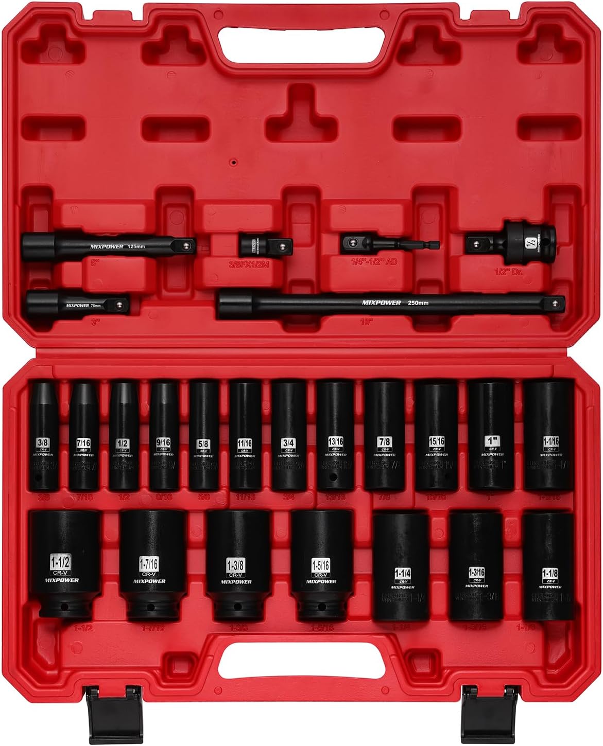 The 33 Pieces 1/2" drive deep impact socket set are made of chrome vanadium CR-MO and CR-V steel. The design allows bit to reach deep into tight space. There are high contrast and specific size marking for identification. It comes with a sturdy and convenient storage case, which keeps each piece in the proper position. All MIXPOWER Tools meet or exceed ANSI performance standards.