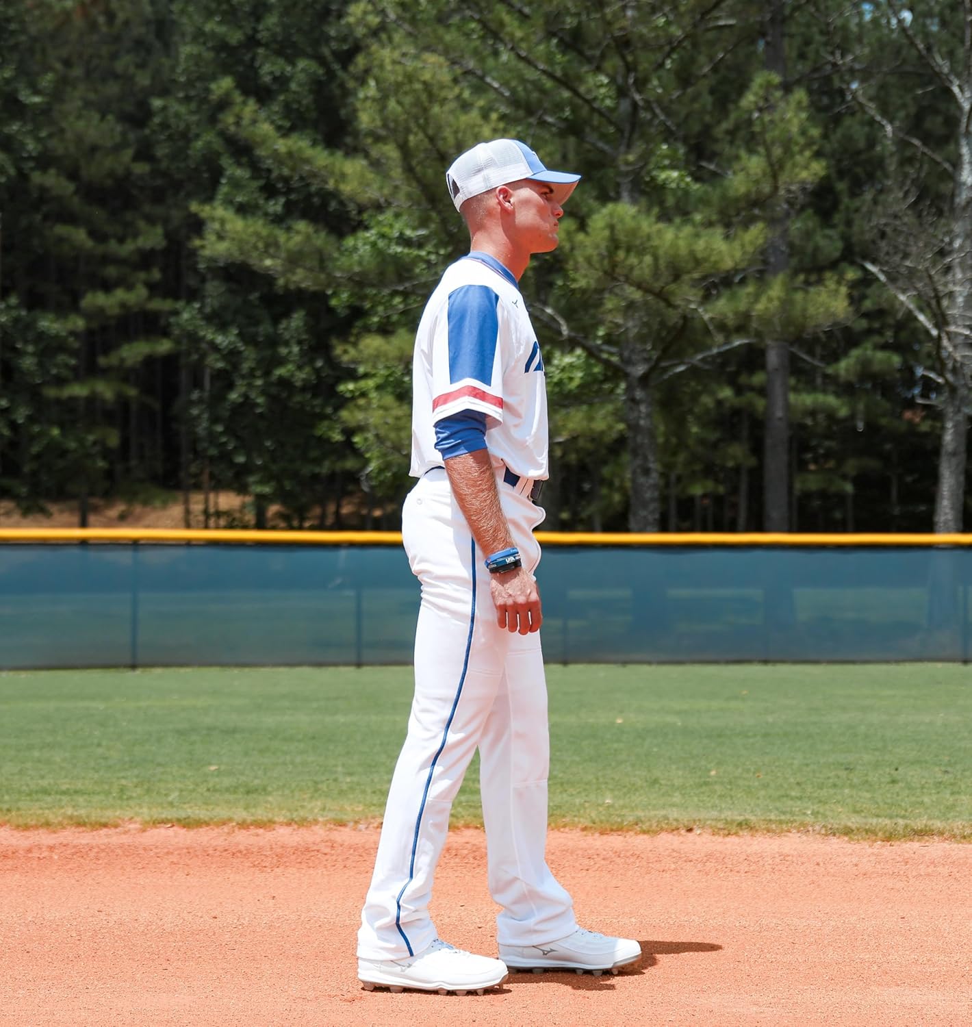 Piped Pro player fit. Tunnel-belt-loop waist. Fly front with extended two-snap closure. Two set-in back pockets with button closure. Double knee. Hemmed bottom.