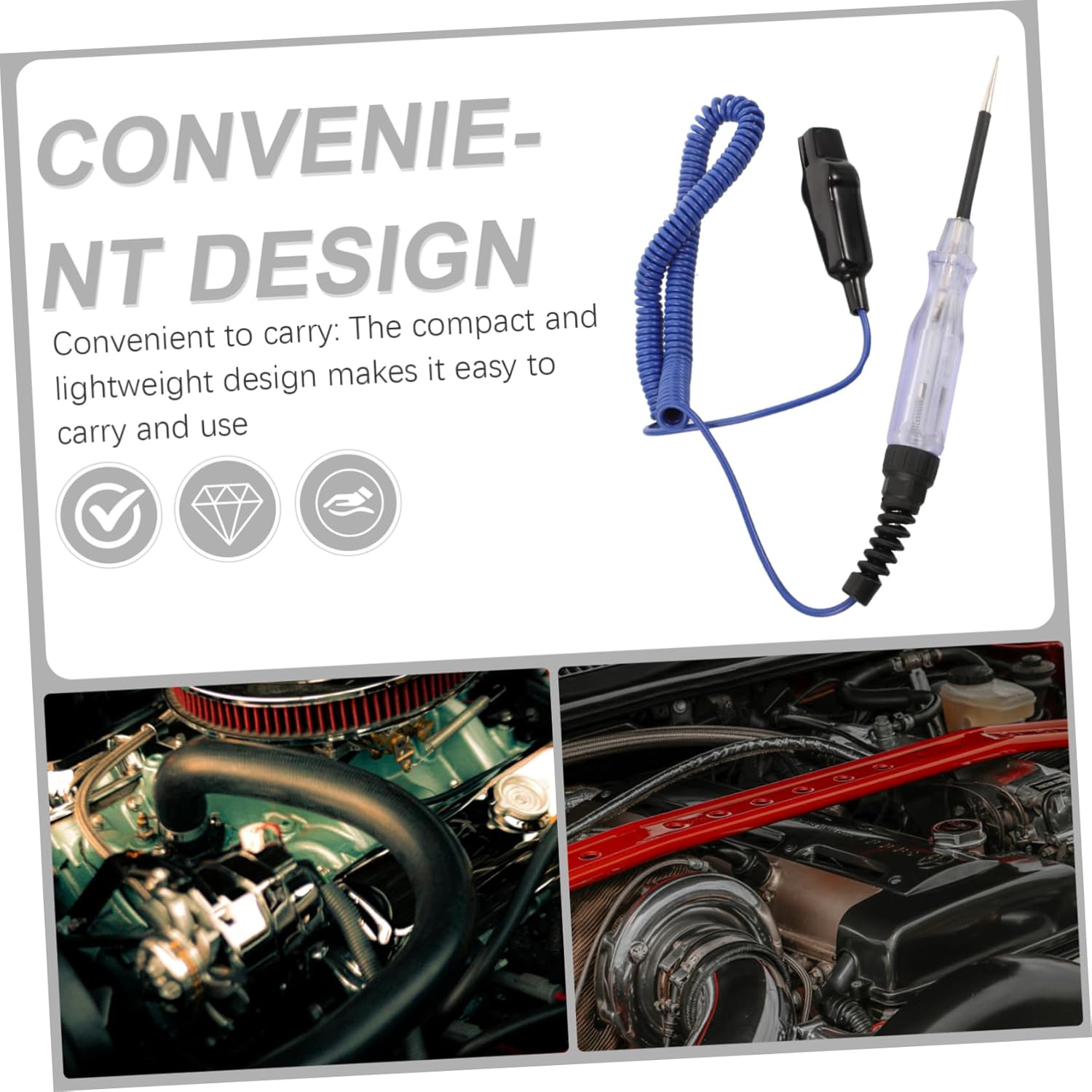 Package Include 5 x car electric tester Characteristics -Color:Multi voltage with spring wire -Voltage range: 6-24V test light automotive -Size:3.50X0.60X0.60cm/1.38X0.24X0 light circuit tester. -Material:Plastic, zinc alloy wire tester -Size:95.00X2.10X2.00cm/37.34X0.83X0 electric tester. -Light weight, one hand operation, will definitely working efficiency automotive light tester for vehicle. -Made of sturdy materials, the electric tester will not easy to get deformed or broken, support long time using low voltage light tester. -The LED test light bulb can indicate circuits’ , easy to use, let you know the positive or negative side electricity tester. -A professional automotive circuit tester with proper DC voltage testing range, ideal for checking various vehicles electrical circuits and so on electrical tester with spring wire. -The spring wire offers more flexibility, lighter and more durable than normal cable wires automotive circuit tester.Goods Informationwire tester electrical tool LED test light to indicate circuits’ , you can attach the alligator clamp either to negative or positive side, while use the probe to touch the other side, easy to use.power tester with spring wire This electric tester has high visibility and withstand long term using