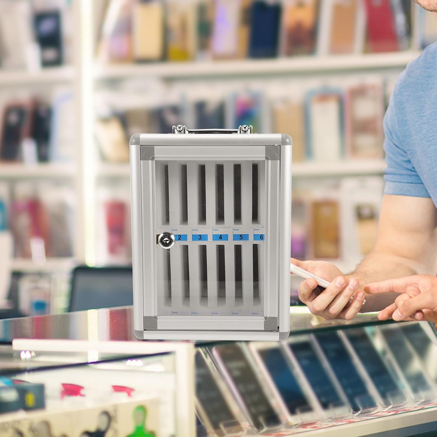 Package List 1 Features -Product Info:Mobile phone box -Material:Aluminum alloy, fiberboard - Size: 27.80X21.30X18.80cm/10.93X8.37X7.39in - ColorLight Grey -With lock design, it is easy to open and close, light weight and compact size, portable and convenient to carry. -Wear-resistant and scratch-resistant, keep your phones tidy and neat, easy to phone storage locker -It is perfect for school, factory, office and meeting. And also a nice to your friends cell phone lockers. -Great for storing most kinds of phones, keeping them in an order way sturdy phone case. -This storage cabinet is adopted by high-grade material, sturdy and for your use.Goods Descriptioncell phone metal storage locker Perfectly works to store students' cell phones, small calculators or other small supplies.sturdy phone case The built-in pearl cotton material is used to prevent abrasion, and the number is arranged to facilitate the search.mobile phone lockers for workplace Made of , this phone storage box can bring much convenience