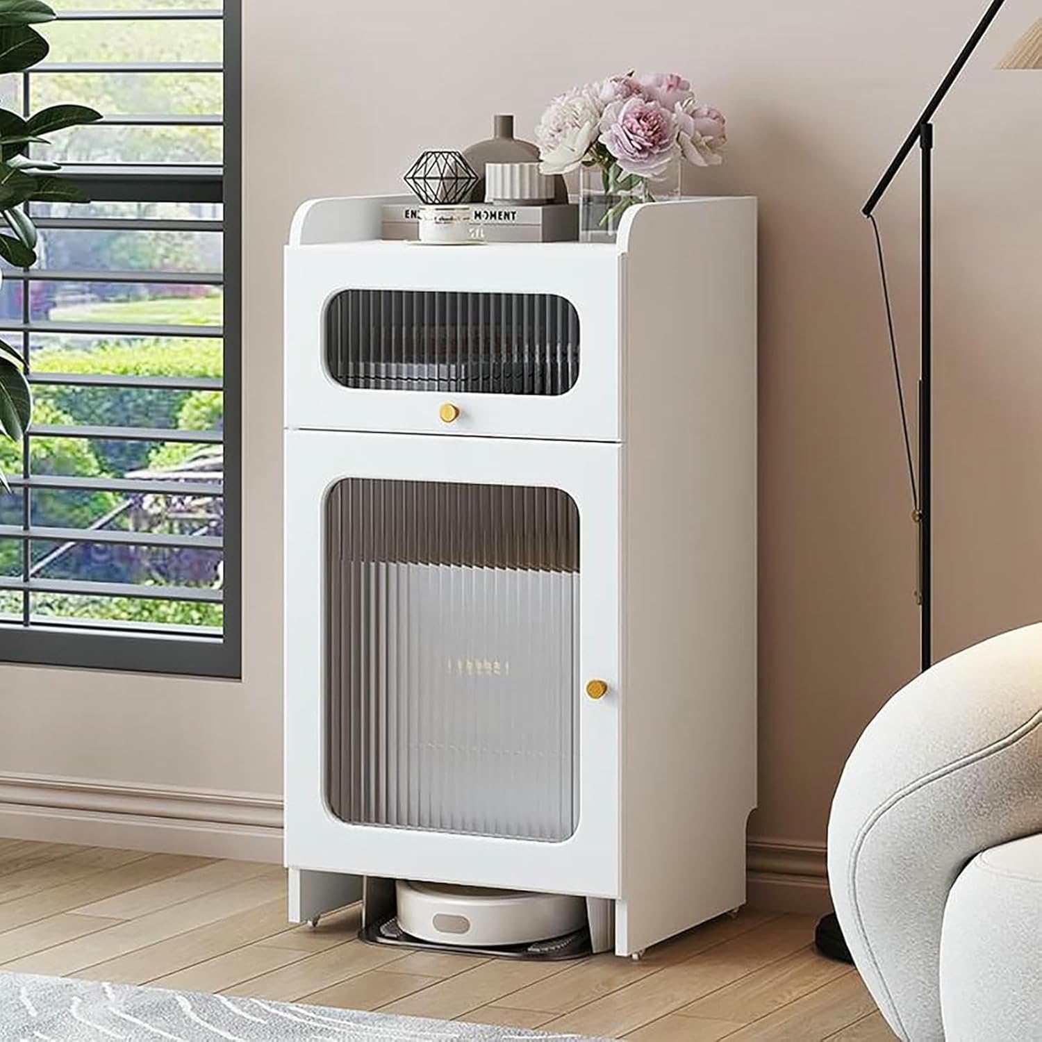 ——This modern Robot Vacuum Storage Rack is the perfect solution for organizing and storing your robot vacuum cleaner while also offering additional storage space for other items. ——In addition to storing your robot vacuum, this stand can also be used as a bookshelf, kitchen shelf, plant stand, nightstand or side table, providing maximum versatility.——Compatible with 98% of robot vacuums, it’s the ultimate cabinet for robot vacuum users seeking a neat, clutter-free space.*Durable wood construction with a modern, wavy glass door provides reliable support for everyday use.*Multiple compartments keep your belongings organized.*Flip-top doors offer easy access.*Smooth-glide wheels make it easy to move around your home.*Quick and easy assembly with the included hardware.【Product Specifications】*Material: Wood + Tempered Glass*Dimensions: 50 x 40 x 92 cm / 19.7 x 15.7 x 36 in*Function: Wheels for easy mobility*Corner Design: Safe and rounded*Multi-purpose Uses: Storage rack, side table, bookshelf, or organizer