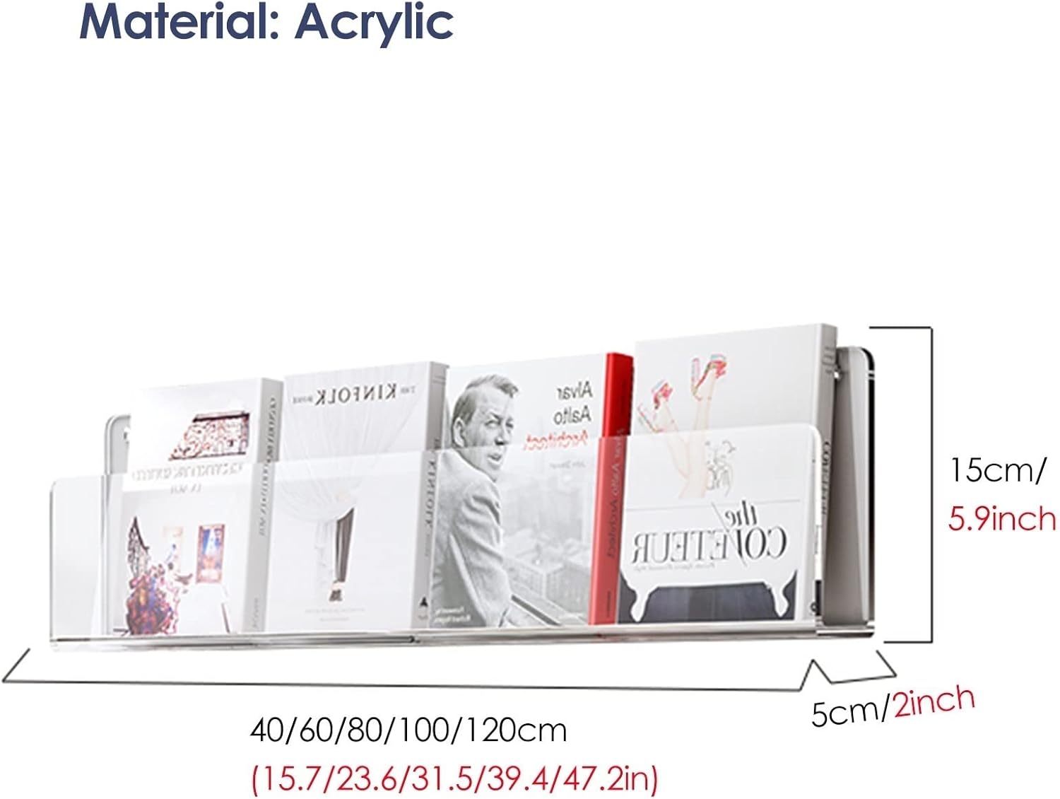 Magazine rack can effectively store journals, brochures, magazines and other materials in office, waiting room and education center. Its transparent display is easy to install on the wall and integrates into any office decoration. Thus it suitable for waiting room, lounge, office, lobby, community center, reception area, doctor's office, school, library and any place where literature needs to be displayed.● Specification:- Material: Acrylic - Size:- Length: 40cm/15.7inch-120cm/47.2inch- Width: 5cm/2inch- Height: 15cm/5.9inch● Feature: - Provides excellent protection for magazines and books from falling.- This kind of material is lightweight and ithas a high strength and resistance to crushing. - Acrylic is transparent, whichallows customers,patients and guests reviewing and selecting the literature.- The magazine holder can effectively store journals, brochures, magazines and other file in office, waiting room and education center.● Package include:- Magazines Rack x 1,(The matching product in the product image is not included in the package).● Note:- Please feel free to contact us if you have any question about the product. We would try our best to solve any problem for you. Wish you have a good shopping experience;- Manual measurement, error 1-3cm, depending on the actual situation, please understand.- There may be some differences between the image and the product due to display and lighting reasons, please refer to the actual product.