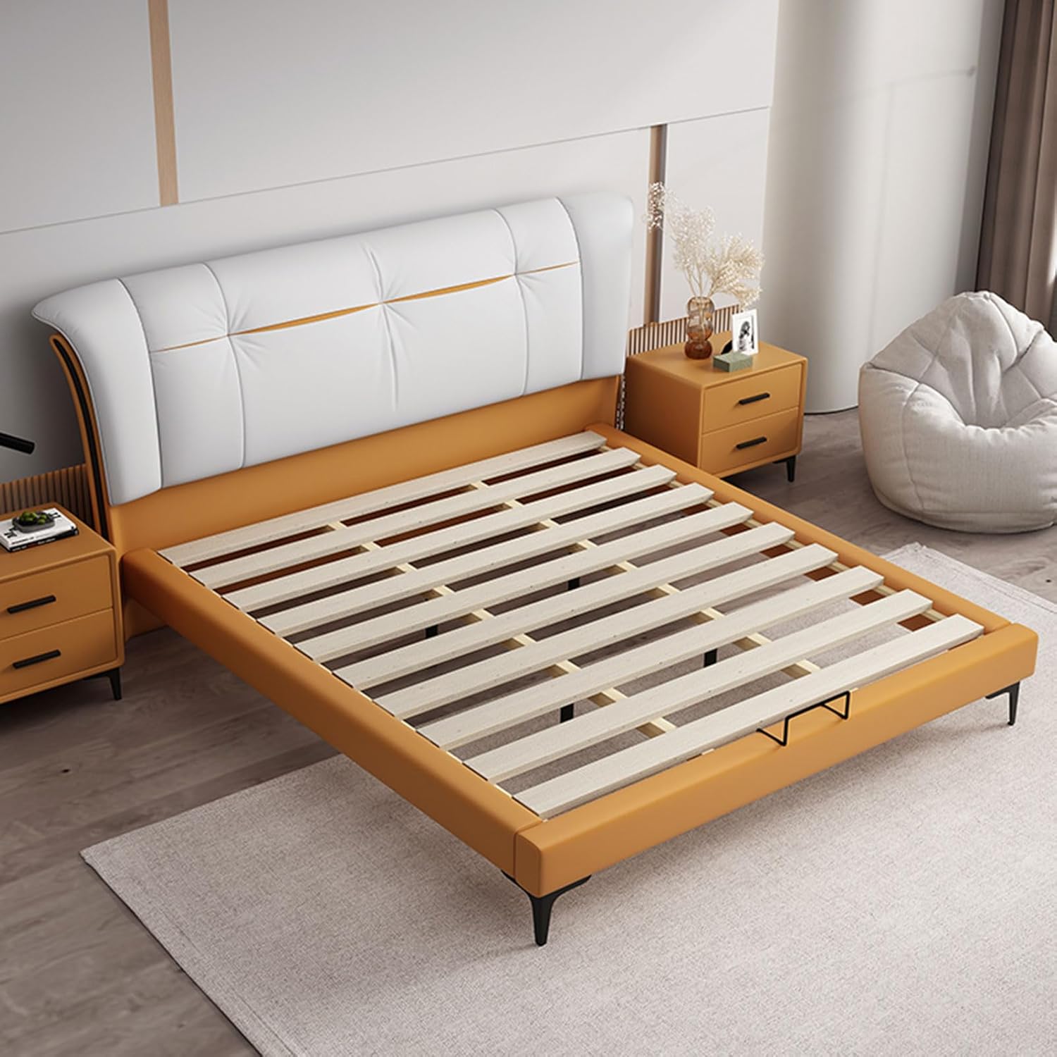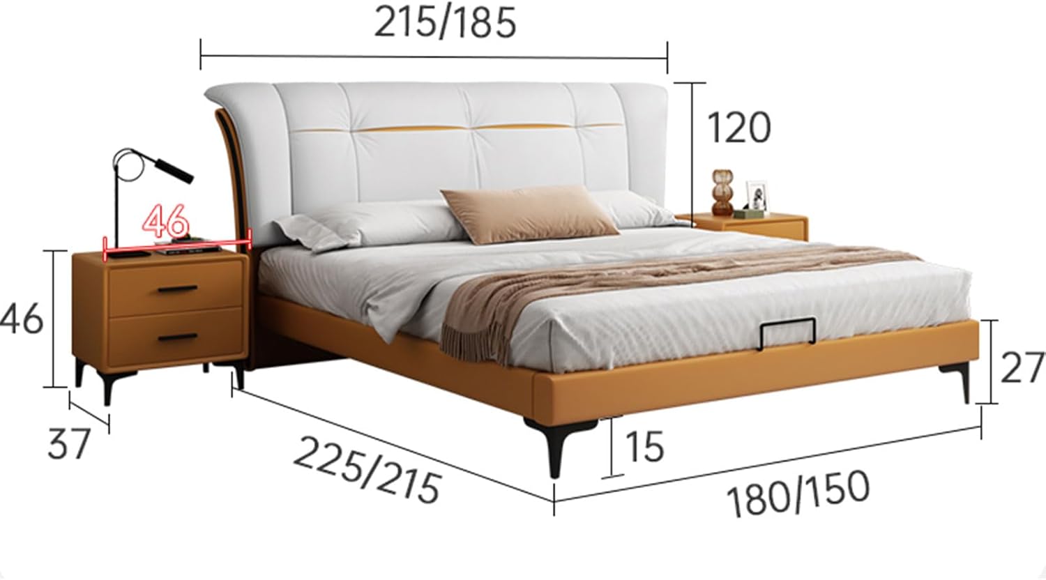 This bed frame features elegant design and maximum comfort that can be adjusted to the height you need. Allow you to use different thickness mattress to cater to your individual needs. Perfect for you to lean on.Material: LeatherMax. user weight 400 LBSBox spring required: NOAssembly required: YESSize: 1.8m X 2mPackage includes:Bed x 1 (No Box Spring Needed )Quantity of package x 1