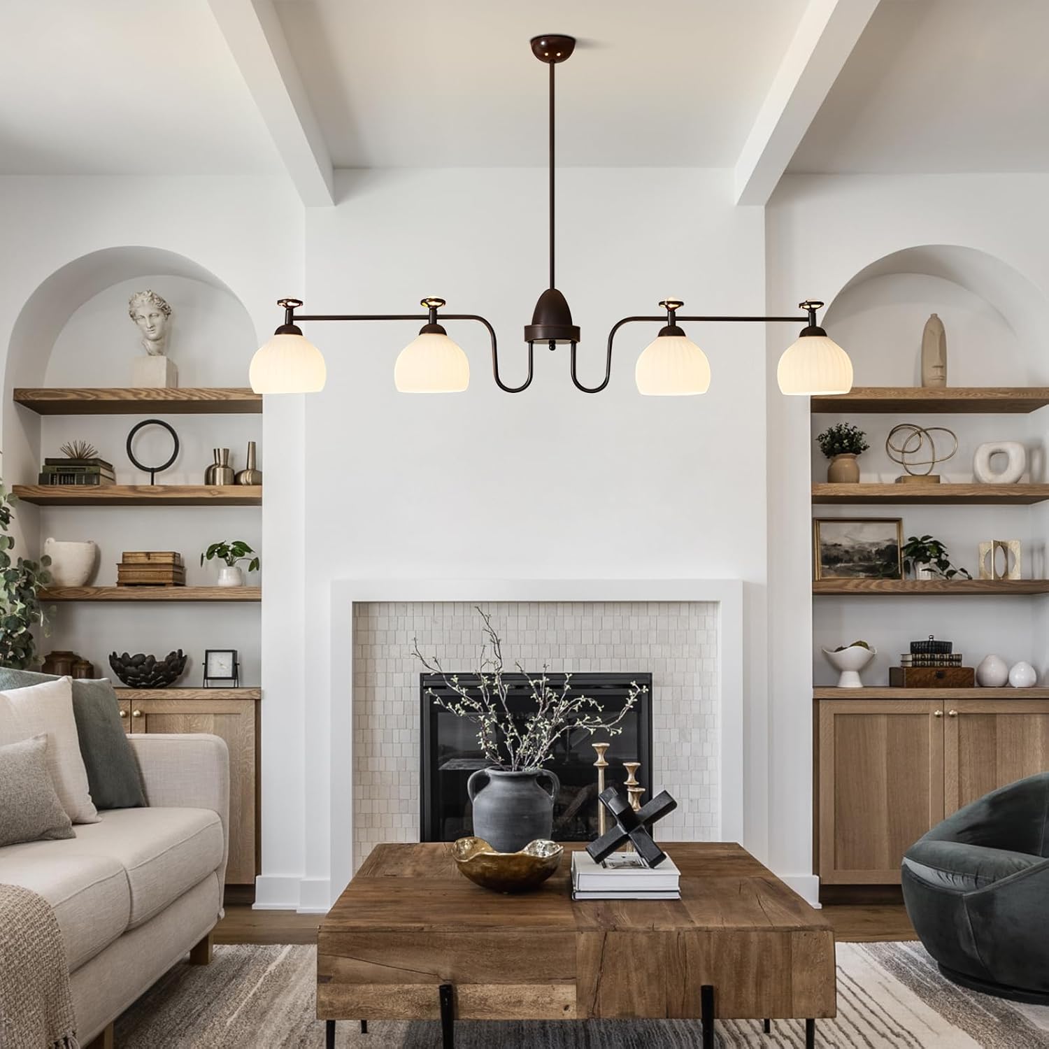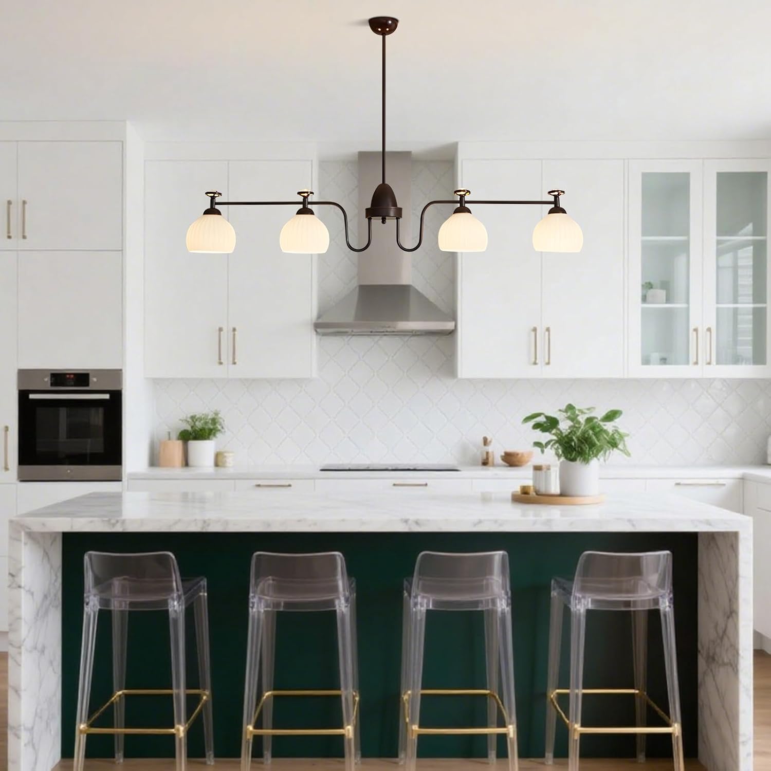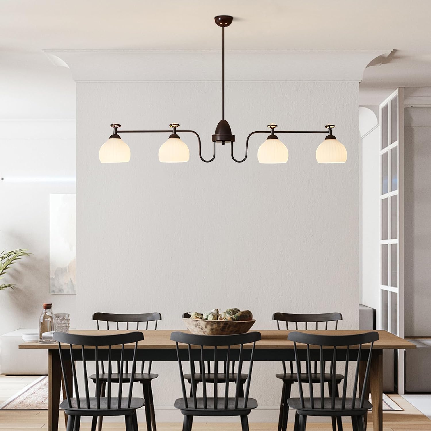 Specifications:Name: :Chandelier/Pendant Chandelier/Ceiling Chandelier/Hanging Light FixturesStyle: Mid Century ModernMaterial: Metal+GlassColor: Coffee colorSize:Length: 120cm/47.2inHeight: 16cm/6.3inBase Diameter: 12cm/4.7inhanging rod: 20+30cm/7.87+11.81inWhether the chain/rope is adjustable: adjustableBulb Informationlight source: E26Bulb Included Or Not: Bulb Not includedNumber Of Lights: 4Voltage: 110-220VWattage: 60W MaxPackage Includes1 x Modern Linear Chandelier1 x Accessories Kit1 x User ManualWarm Tips:1.Please keep all small parts out of children's reach during installation.2.For a safe installation, we advise consulting a licensed electrician if needed.3. Please don’t connect electricity until your fixture is fully assembled.