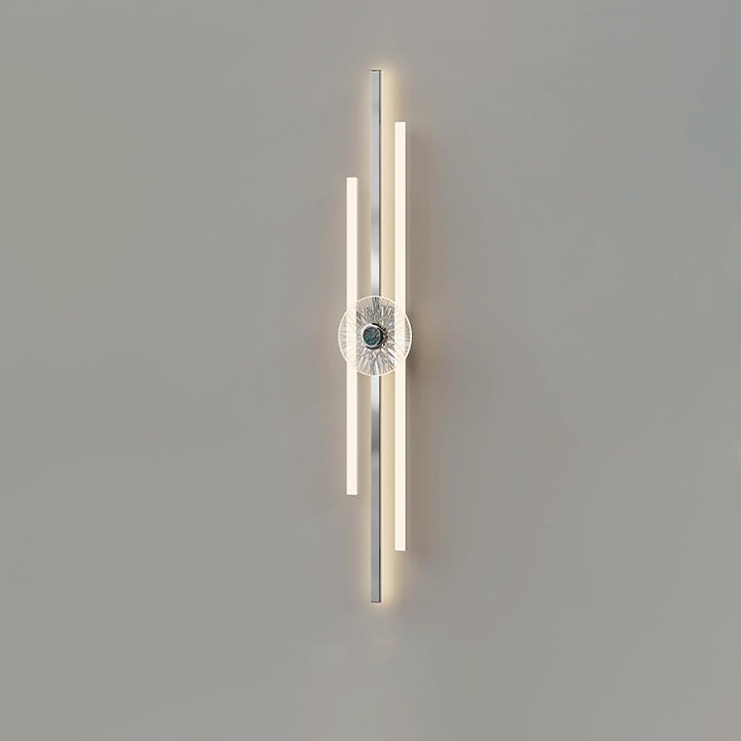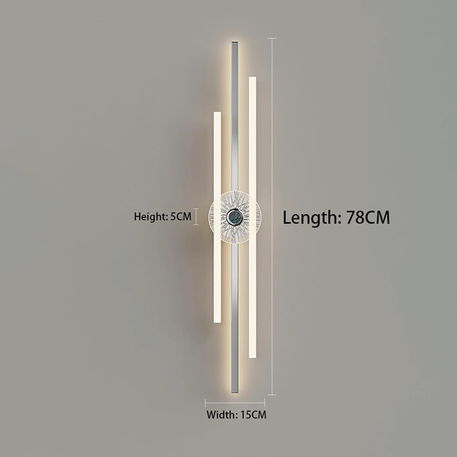 Product Parameters:Type: Wall Sconce / Wall LampStyle: Modern, Minimalist, Contemporary, Light Luxury, Design Style, Long Strip, Geometric, Decorative, Ambient LightingMaterial: Hardware (base, internal structure), Aerospace Aluminum (lamp body, strips)Color: Electroplated Chrome/Silver (main strips), White (light-emitting strips), Green/Blue (central decorative accent)Dimensions:Length: 30.7" (78cm)Width: 5.9" (15cm)Height (Thickness/Projection from Wall): 2.0" (5cm)Light Source: LED Color Temperature: tri-color dimmable.Bulb Included: YesCraftsmanship: Polishing, Grinding, Electroplating & Wire DrawingOptimized Special Feature: This striking modern minimalist wall luminaire features a sleek long strip design, crafted from aerospace aluminum with a sophisticated electroplated chrome finish. It integrates multiple LED light strips, creating a dynamic visual effect, complemented by a unique central decorative element. The meticulous polishing, grinding, and wire drawing craftsmanship highlight its light luxury appeal. Perfect for adding a contemporary statement and ambient lighting to living rooms, corridors, or bedrooms.Applicable Space: Ideal for Living Room, Corridor, Hallway, Bedroom, Entryway, Office, Hotel Rooms, or any space desiring modern minimalist design, decorative lighting, and a sleek contemporary aesthetic.